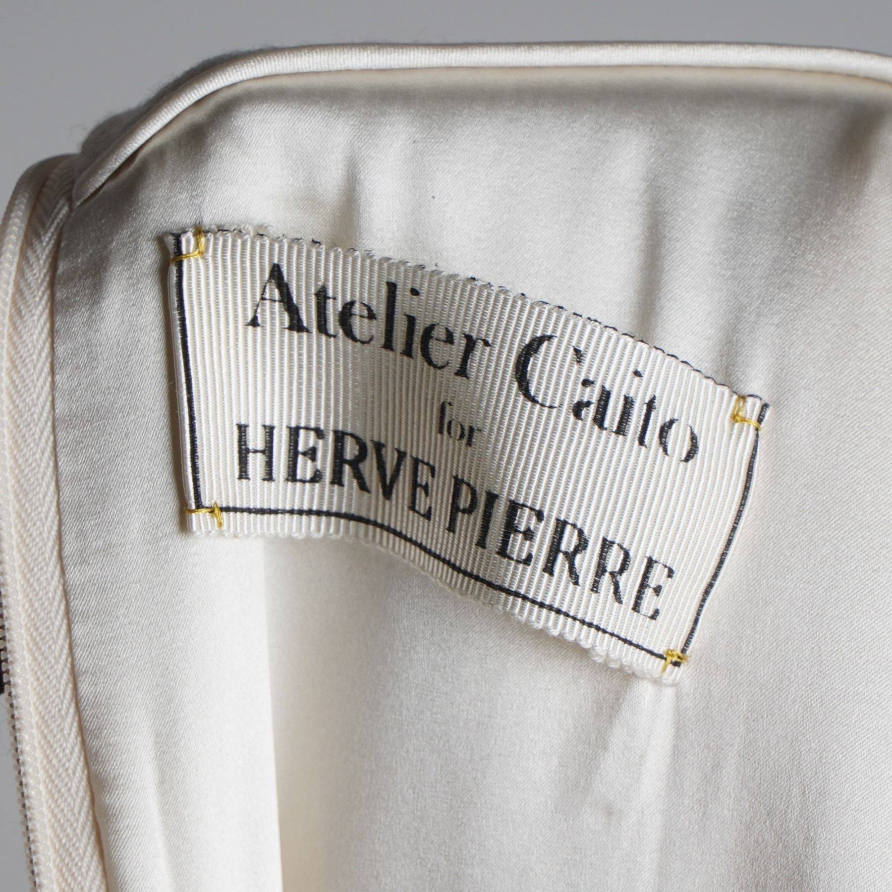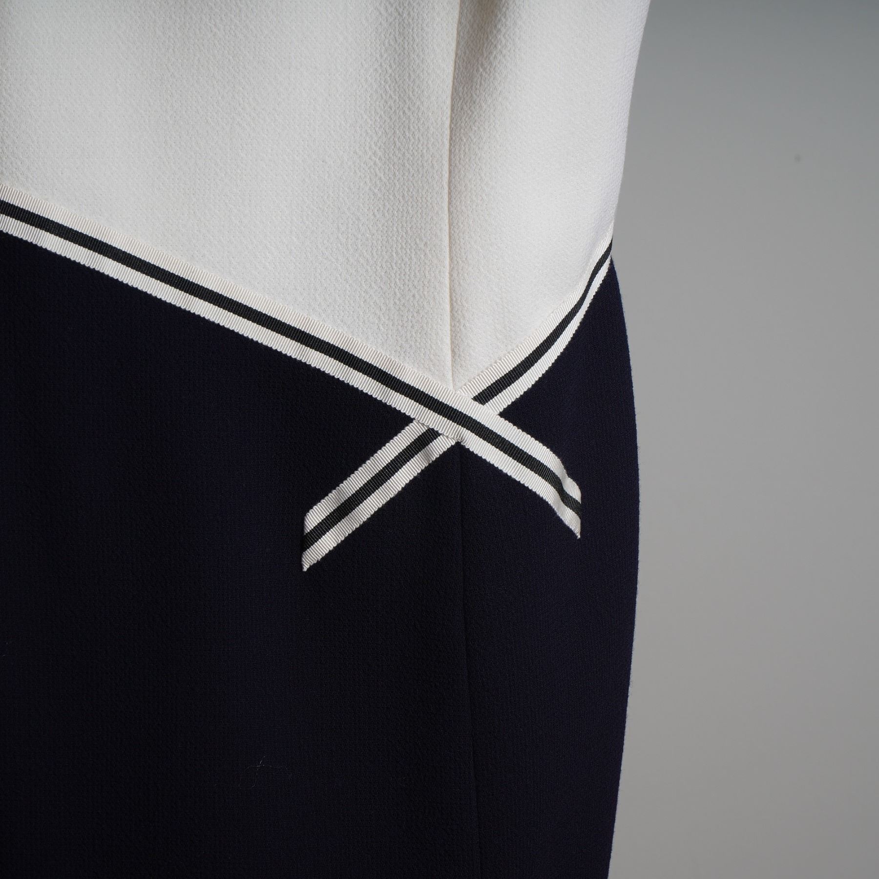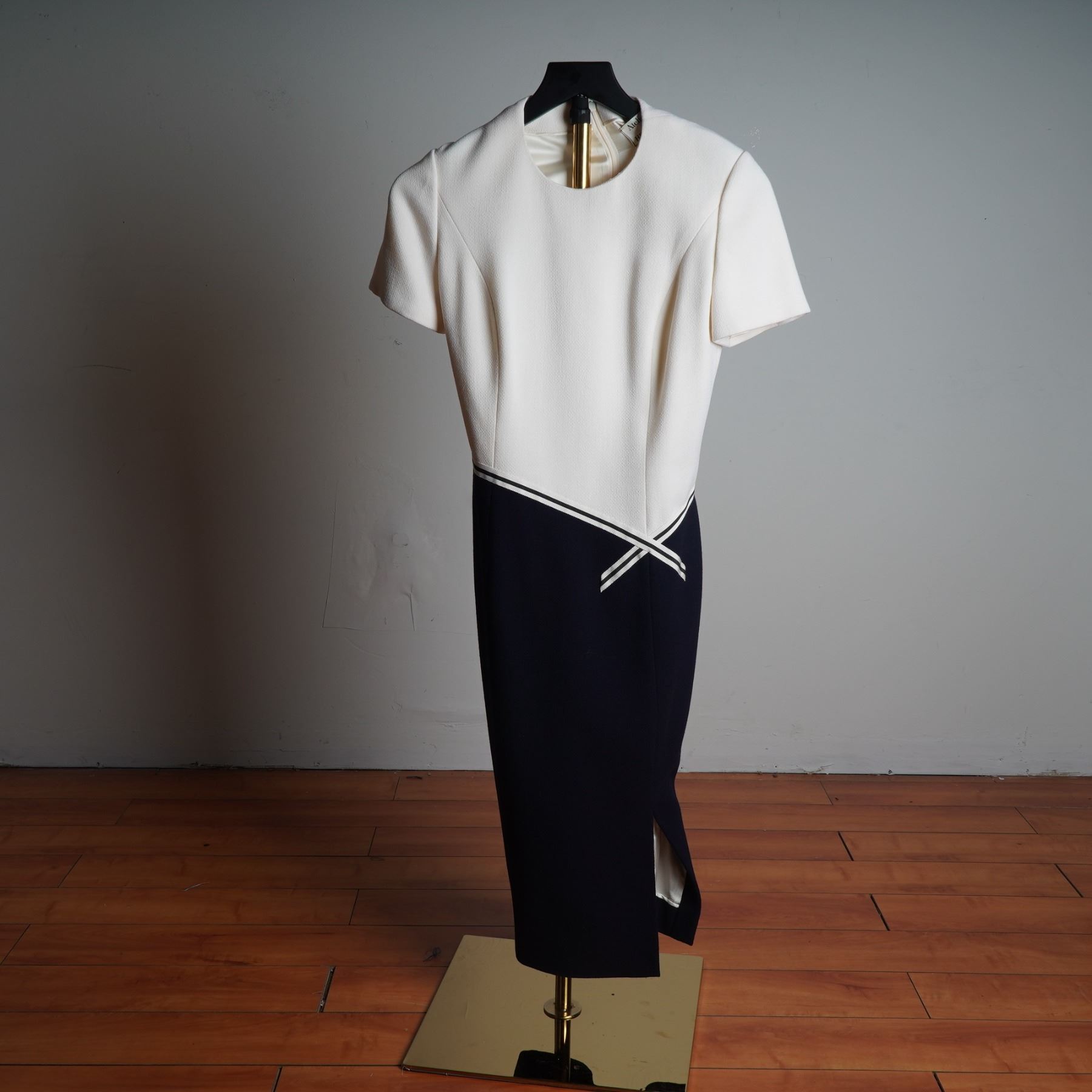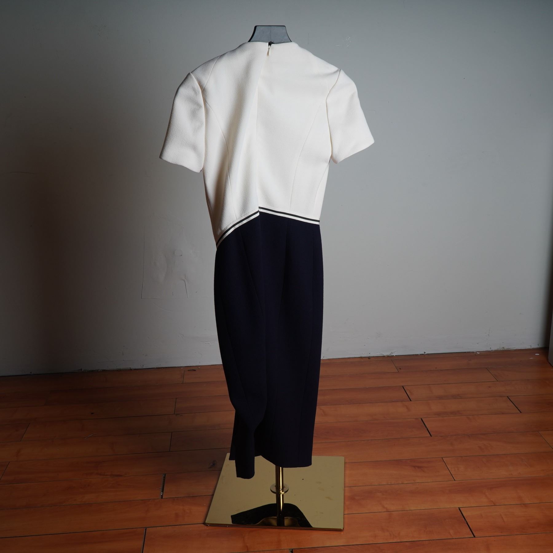 An exceptional piece of couture craftsmanship by Atelier Caito for Herve Pierre, this sophisticated dress is a study in modern elegance. The colorblock design features a structured cream wool bodice with a sculpted silhouette and short sleeves, beautifully contrasted by a sleek black skirt with a precision-cut asymmetrical waistline detailed in double-striped white grosgrain ribbon. A slit at the hem adds ease of movement while maintaining a tailored, refined silhouette. The high-quality construction and precise seamwork reflect the designer's pedigree in custom luxury fashion, making this a standout piece for collectors and fashion aficionados alike. Interior label reads Atelier Caito for Herve Pierre. Concealed rear zipper closure. Size 4.