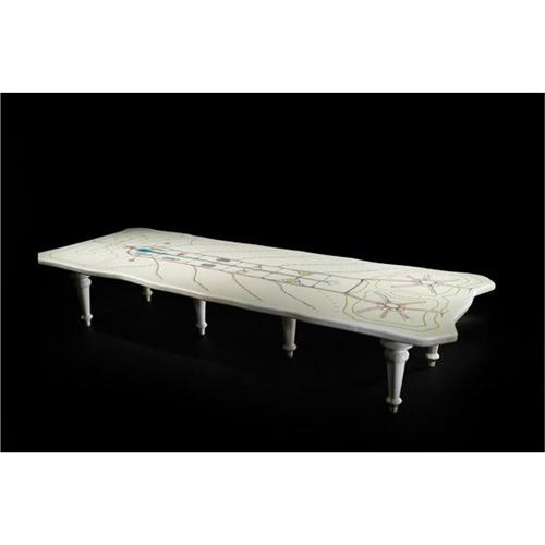 Atelier van Lieshout<BR>Urban Plan dining table<BR>The Netherlands, 2007<BR>enameled fiberglass<BR>162 w x 58.5 d x 30 h inches<BR>The exploration of environment and society (and finding a balance between the two) are recurring themes in the multidisciplinary works by Atelier van Lieshout. The decoration of this tabletop depicts the urban plan for SlaveCity, a conceptual green and efficient city that turns utopian ideology upside down by presenting a more sinister view of controlled society. This example is number one from the edition of five aside from one artist's proof. Incised signature to applied label to underside: [Lieshout, AVL 001124].<BR><BR>Condition of the item is not included in this description. Condition reports are available from Wright upon request. Wright strongly recommends that you review a condition report for each item on which you plan to bid.