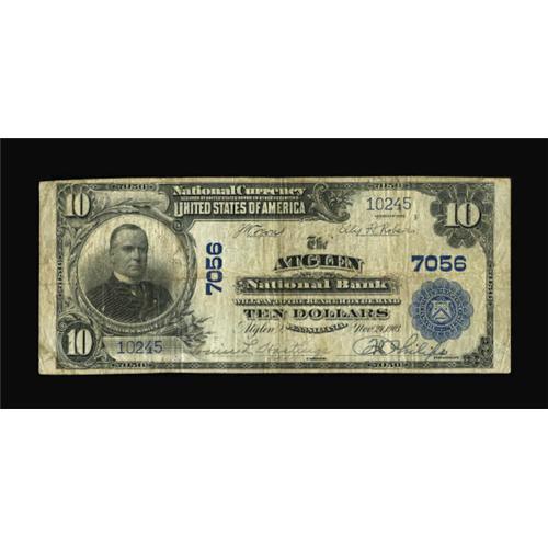 <B>Atglen, PA</B></I> - $10 1902 Plain Back Fr. 624 <B>The Atglen NB</B></I> Ch. # 7056<BR> This small town is one of the more obscure locations in well collected Chester County, and offers a nice way to start off this offering of notes from this sought after location. Most of the notes in this collection were accumulated in from 1975 through 1990, and have been off the market since they became part of this collection. This piece is new to the census, which lists just seven large examples extant from here, with no appearances in large, according to Track and Price, in almost ten years. Evenly circulated <B>Fine,</B></I> with the clear pen signature of female Ass't. Cashier Louise L. Hastings as an added bonus. <BR><BR><b>Shipping:</b> Coins & Currency (<a target="_blank" href="http://www.heritageauctions.com/common/shipping.php">view shipping information</a>)