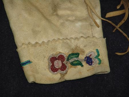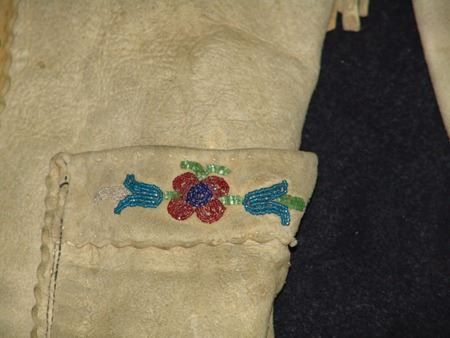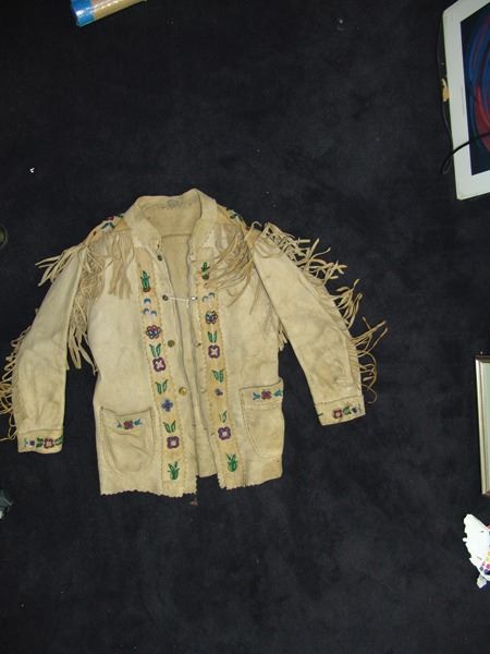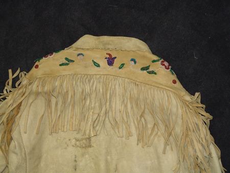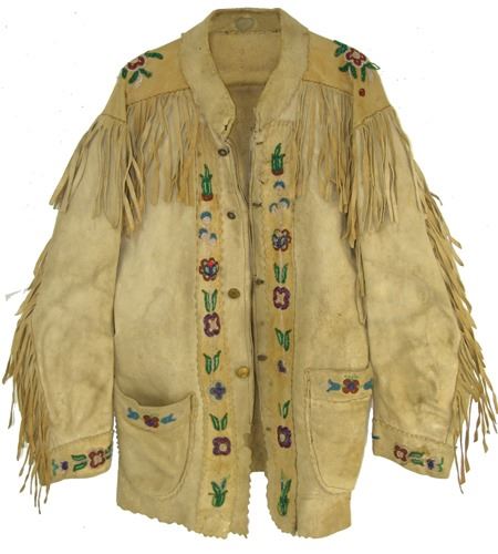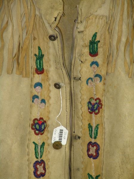 Ca. 1940s, Traditional heavy tanned moose hide coat with zip front, fringe, scalloped trim, and classic beaded floral decorations. Good usable condition. 29" x 20"