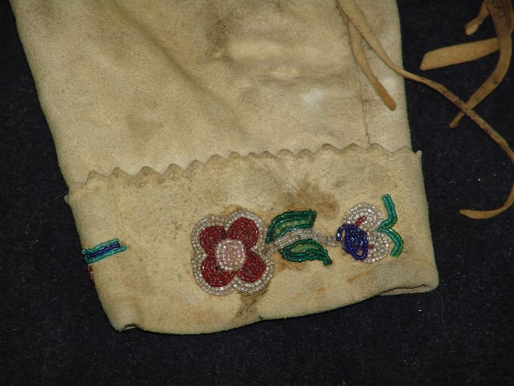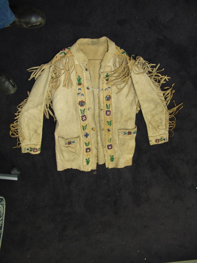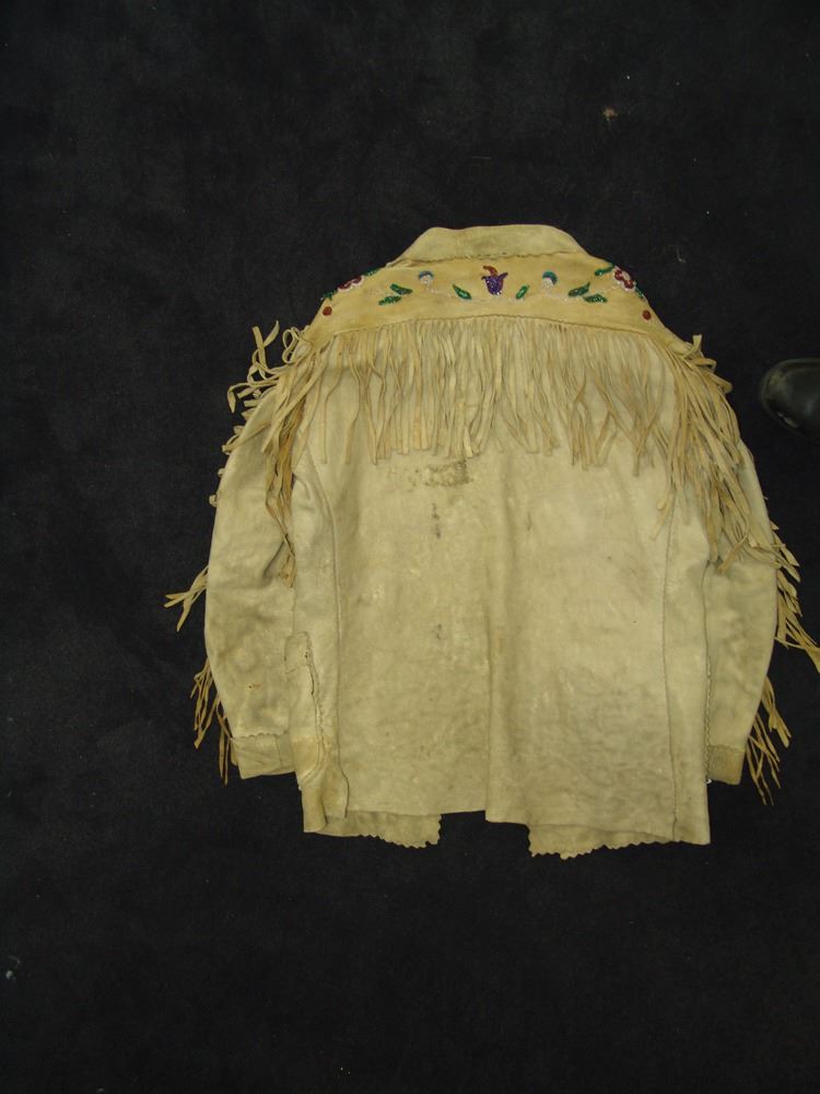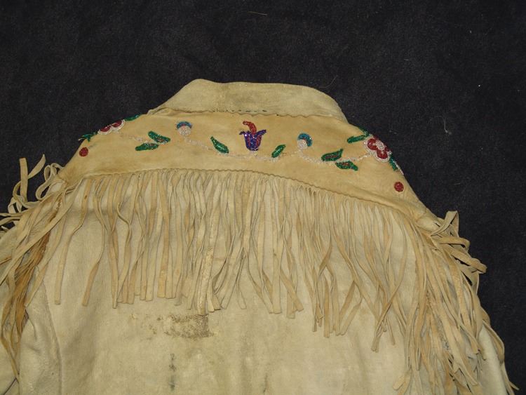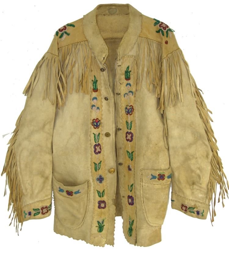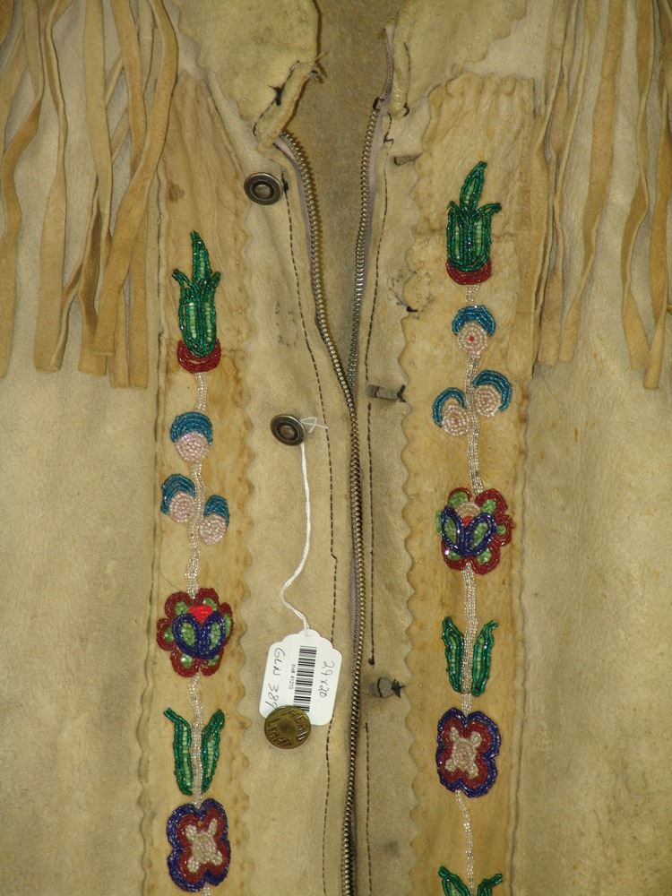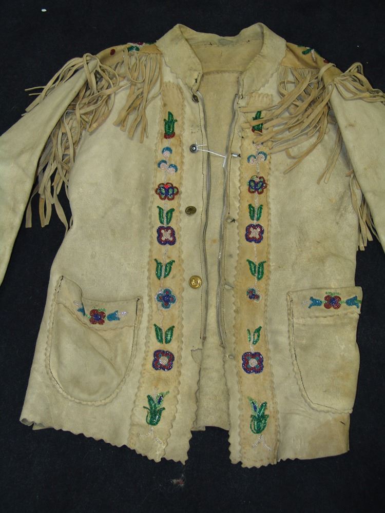 Traditional heavy tanned moose hide coat with zip front, fringe, scalloped trim, and classic beaded floral decorations. Good usable condition.,Ca. 1940s,29" x 20" (BDWK)