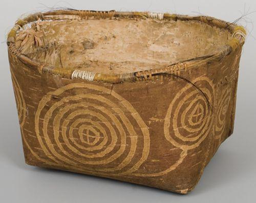 Athabascan Birchbark Basket. 7 ½” x 14". Nice designs. Rim has quillwork and horsehair. c. 1920. Shows use but these older birch bark baskets are scarce. Good condition. (est $400-500)