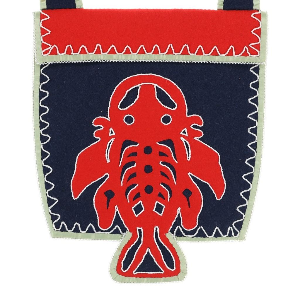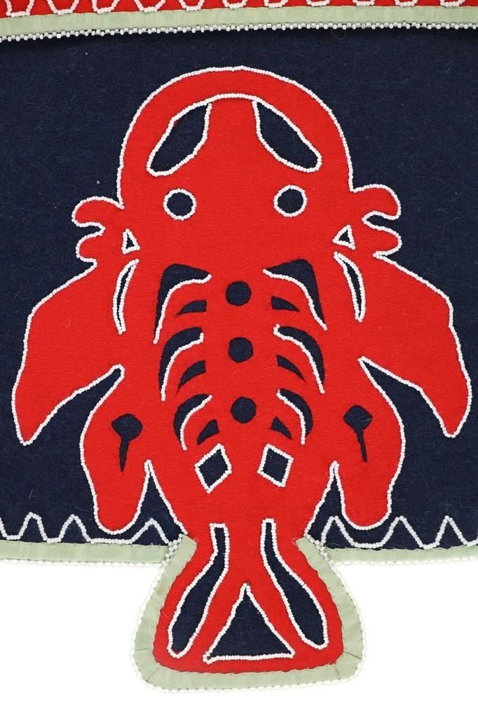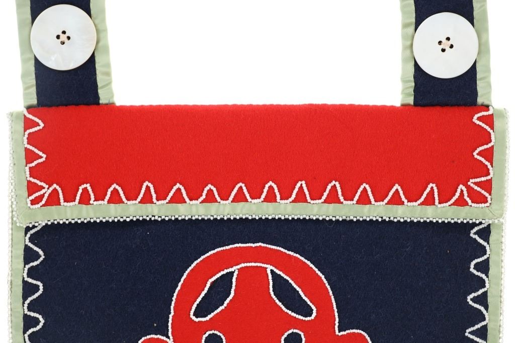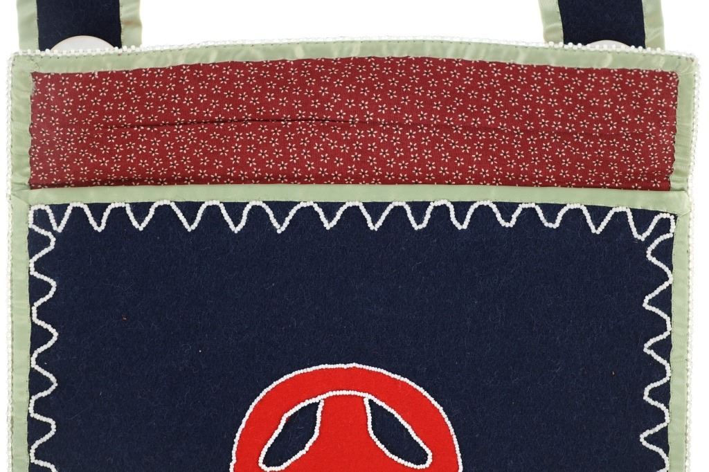 This is an original Northern Athabascan Dog Fish Fire Bag on trade clothe with beadwork. The fire bag or firebag is referred to as a K’enq’ena viqizdluyi in Dena’ina Athabascan (as noted by Helen Dick and Michelle Ravenmoon). The bag shows red and dark blue wool and calico trade clothe with glass trade seed bead greasy white beadwork with a dog fish or dogfish totem. There are six large hand carved mother of pearl beads on the sash. Collected from the Northwest Coast in 1985, exact age unknown. Truly a unique piece. Measures overall 31”L by 11“W.