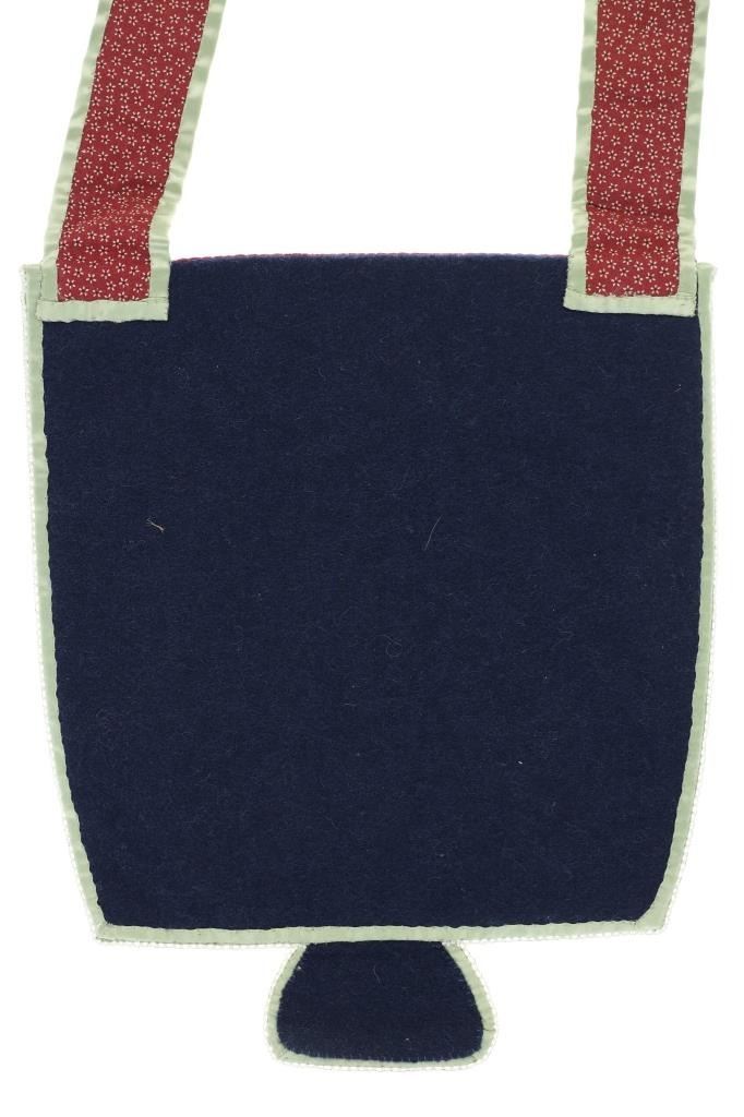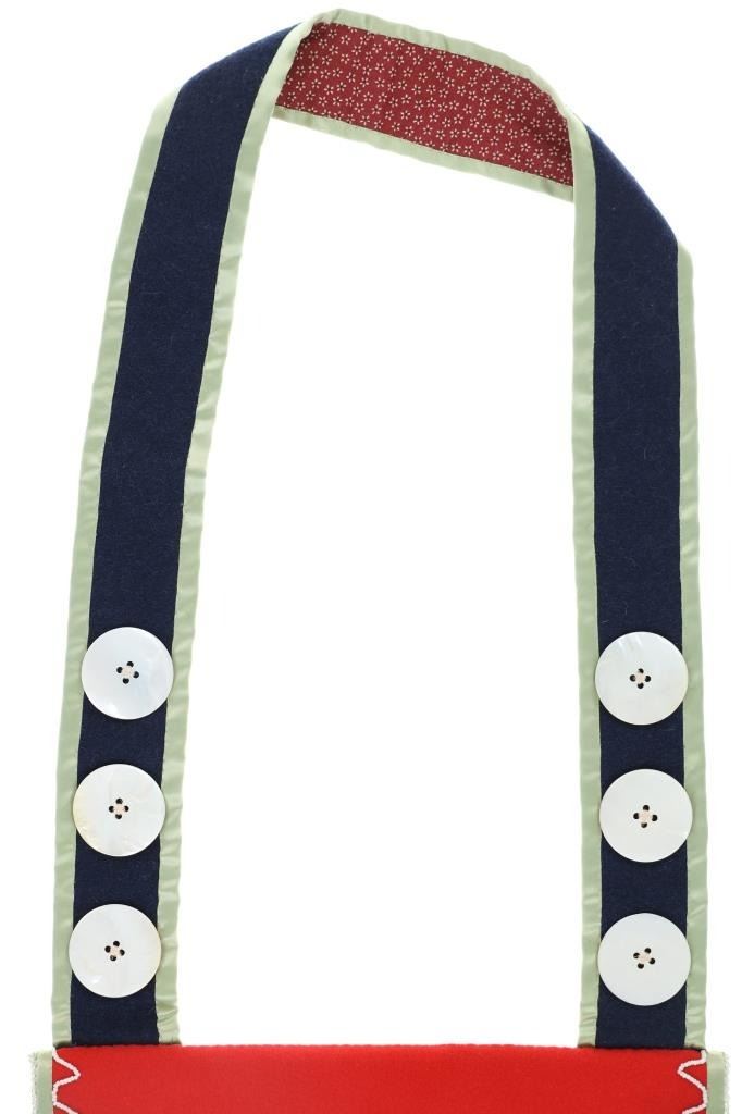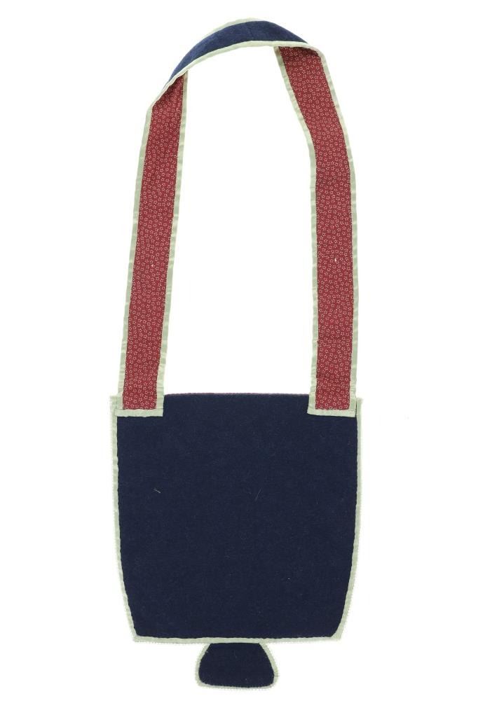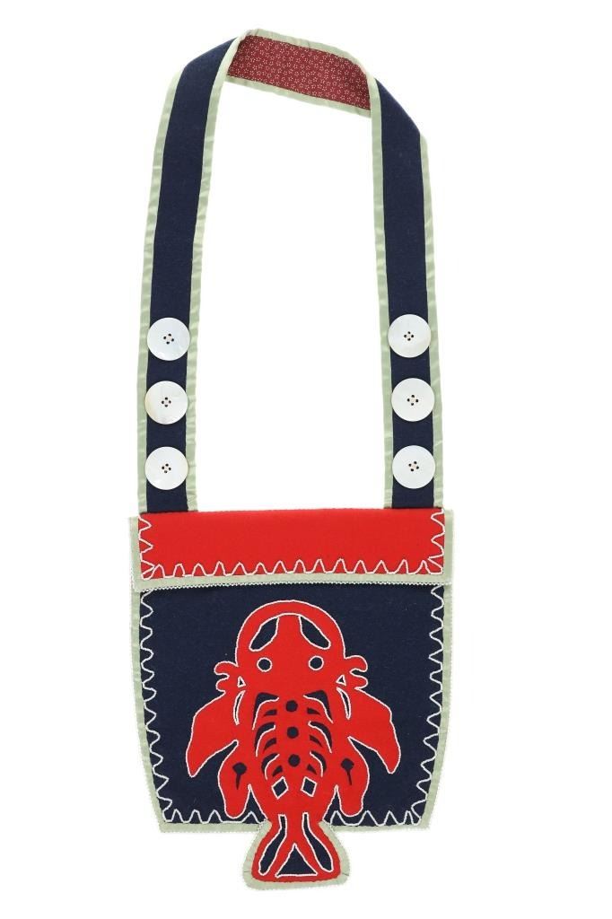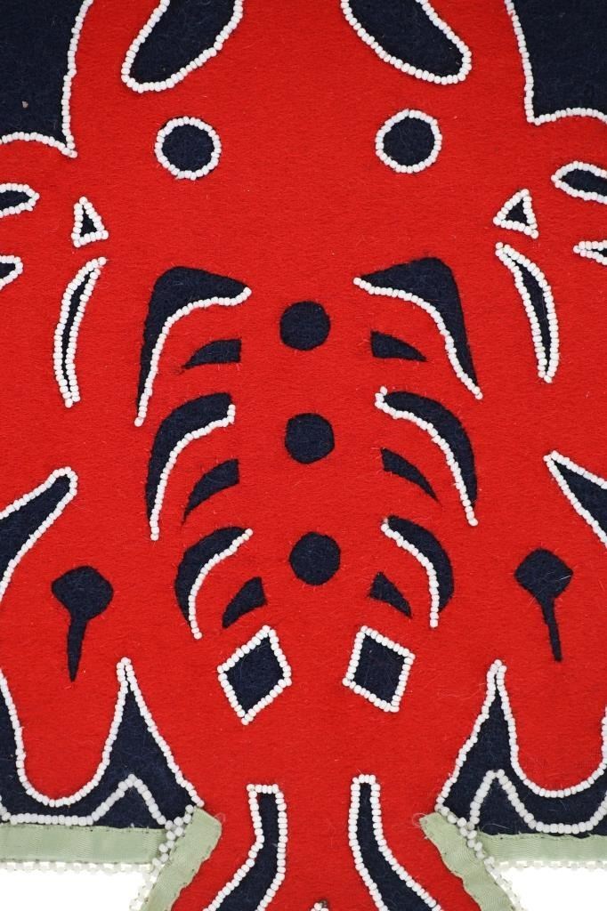 This is an original Northern Athabascan Dog Fish Fire Bag on trade clothe with beadwork. The fire bag or firebag is referred to as a K’enq’ena viqizdluyi in Dena’ina Athabascan (as noted by Helen Dick and Michelle Ravenmoon). The bag shows red and dark blue wool and calico trade clothe with glass trade seed bead greasy white beadwork with a dog fish or dogfish totem. There are six large hand carved mother of pearl beads on the sash. Collected from the Northwest Coast in 1985, exact age unknown. Truly a unique piece. Measures overall 31”L by 11“W.