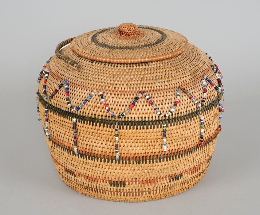 Athabascan Knob Top Handled Willow Basket with Beaded Design Deaccessioned Glenbow Museum Collection 10" D. 8 1/2" H. Fine Condition