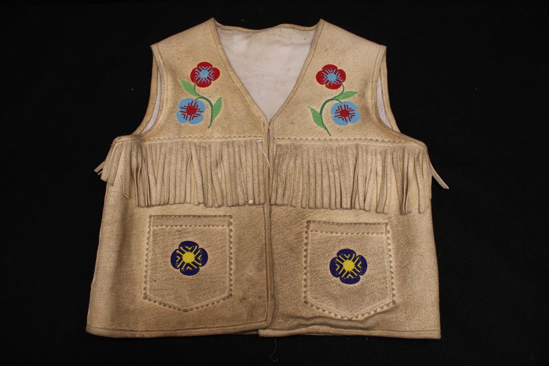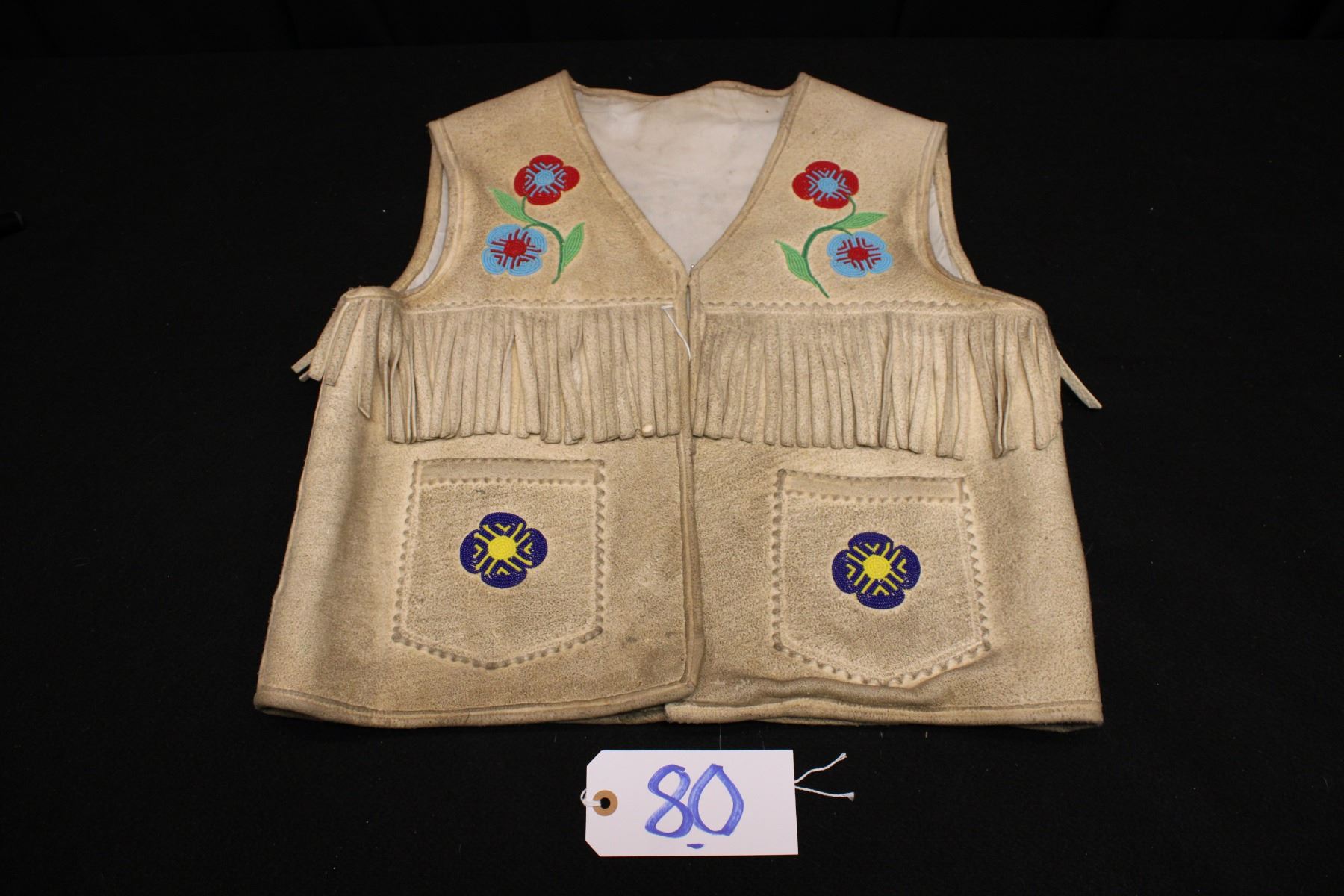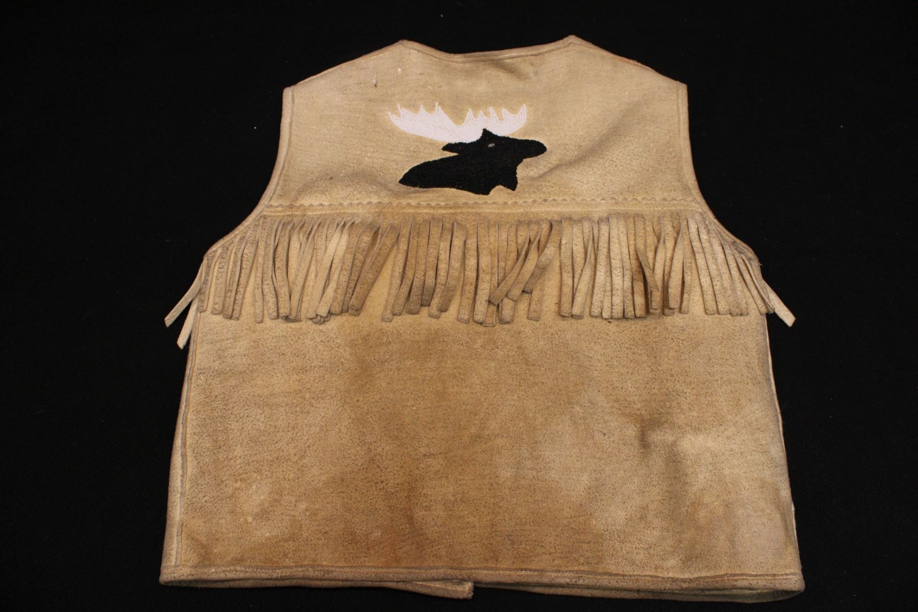 Flowers on front/moose on back. Fringe. 20.5" w x 21" h