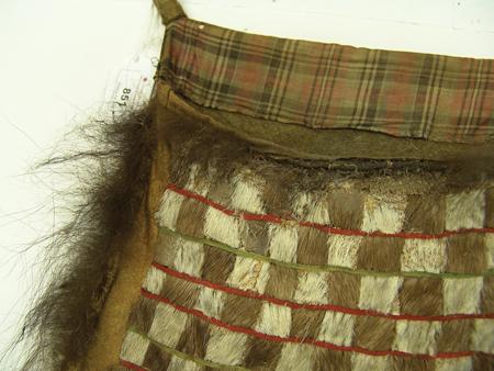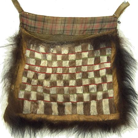 Circa Early 1900s, Rare patchwork sealskin, bear hide, and moose hide flap bag used to hang from a sled. Very good condition. 12-1/2" x 12"