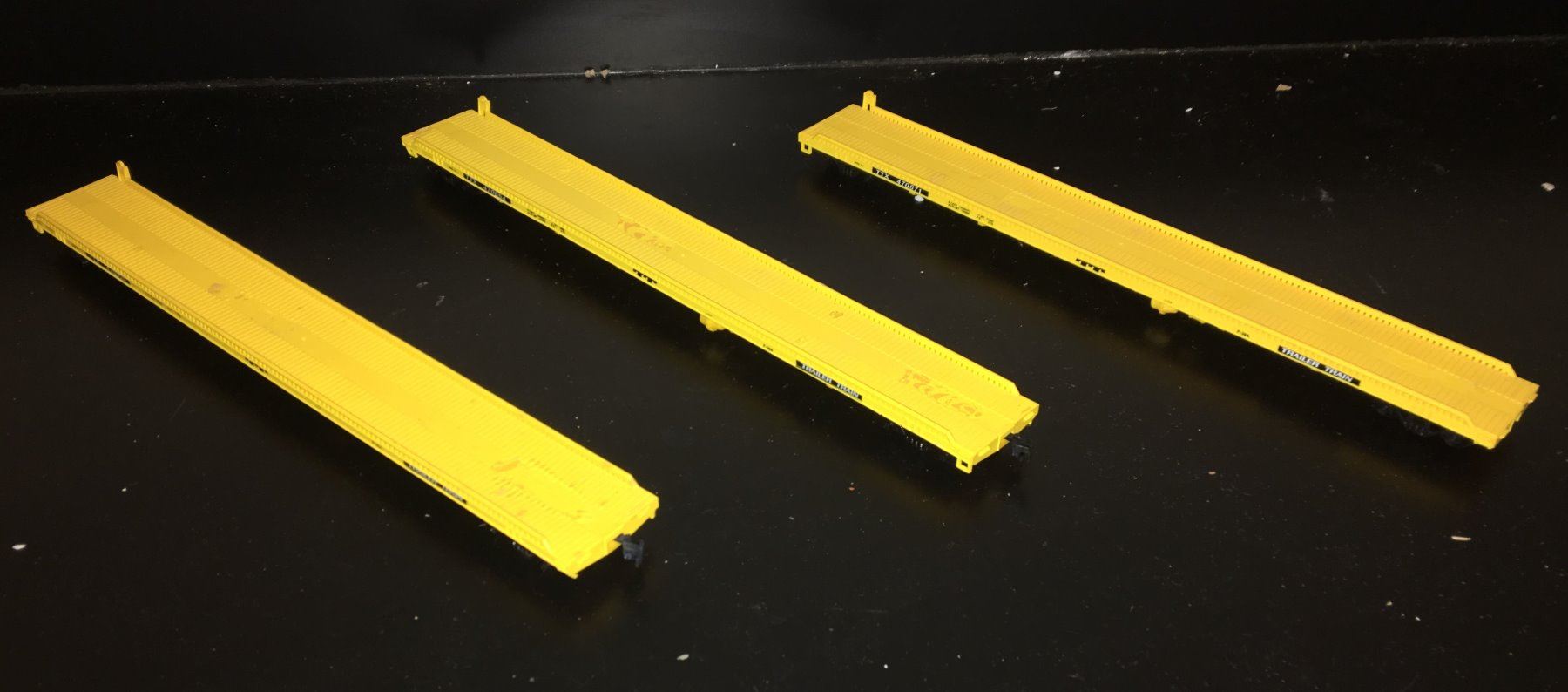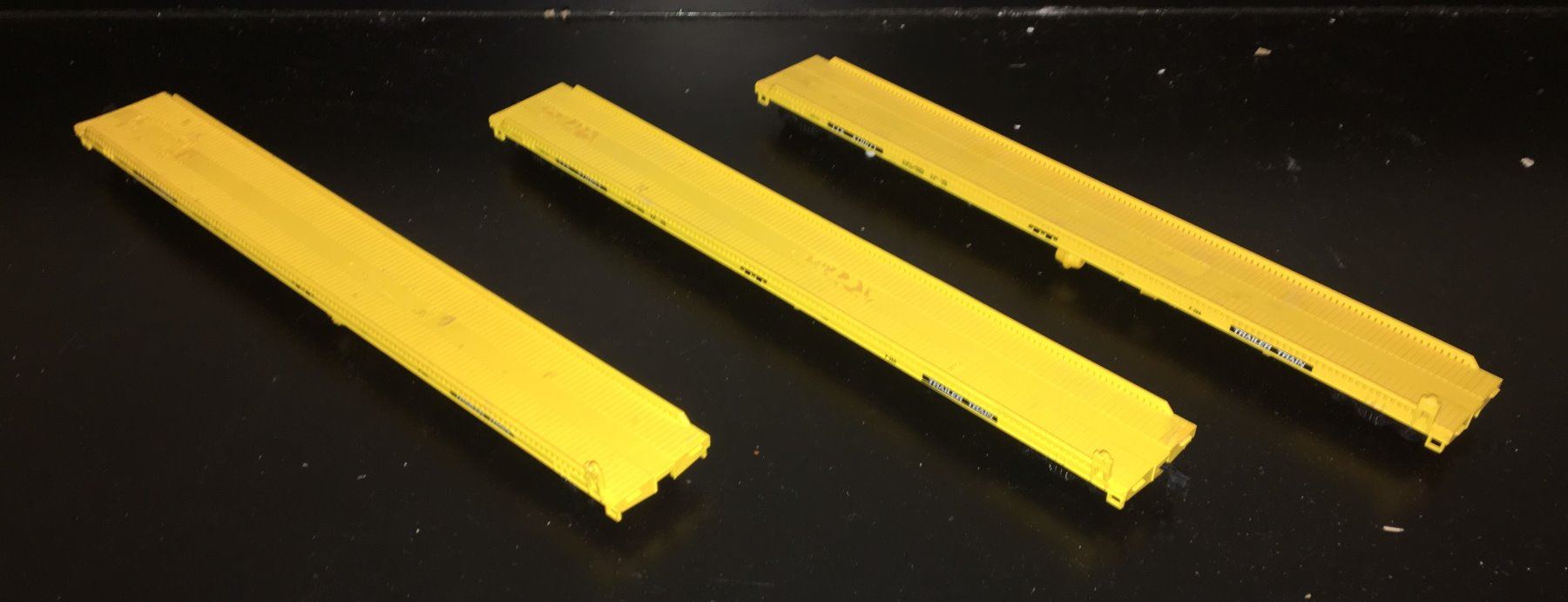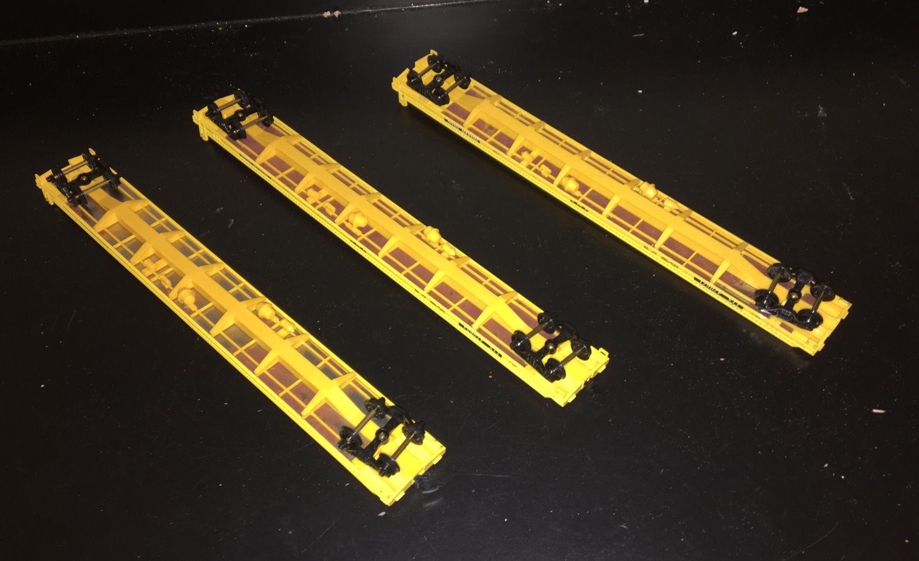 Athearn HO scale 3-car trailer train. The cars are each about 12 inches long. Some missing couplers and brake wheels.