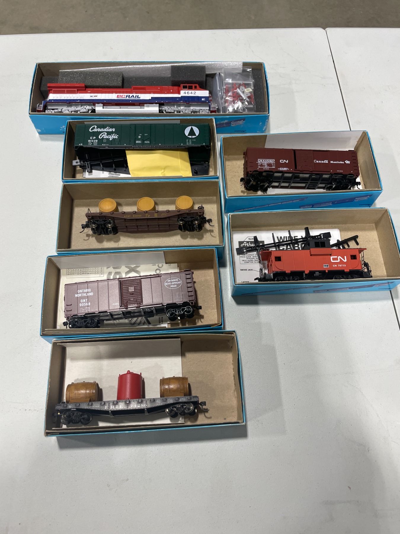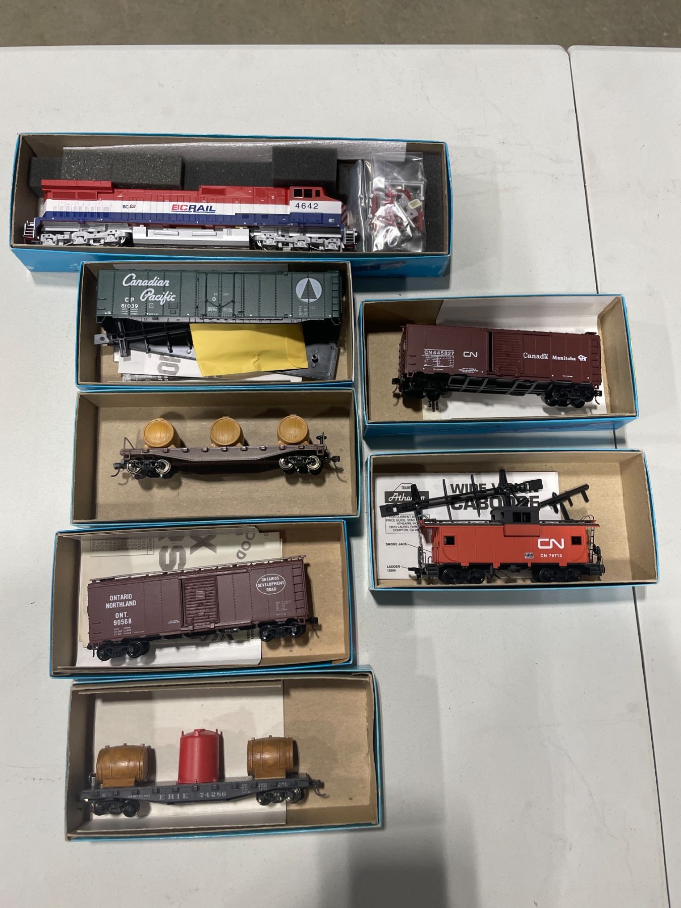 Includes 40ft Reefer Kit - Bev-Bel Corp. #1382 Canadian National "Canada Manitoba" (Tuscan Red/#445827) 40' Boxcar - Canadian Pacific #1328 50ft. Plug Door Boxcar - Bev-Bel Corp #1199 Ontario Northland "Development Road" (Tuscan Red/#90568) 40' Boxcar - W/V caboose CN #5372 - 50ft PD Box Canadian Pacific #1328 - C44-9W Power BC Rail No. 4642 #4927
