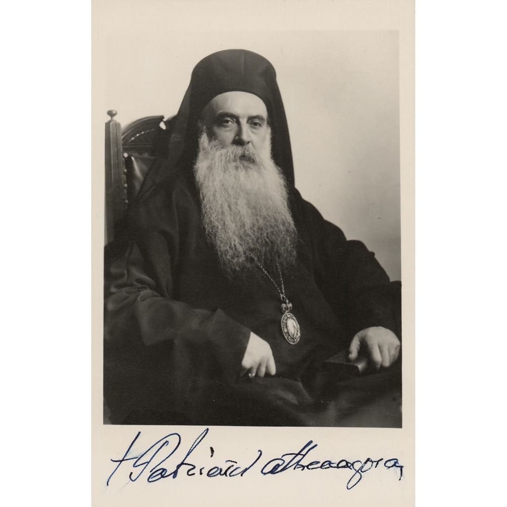 Greek Orthodox bishop (1886–1972) who served as Ecumenical Patriarch of Constantinople from 1948 to 1972. Vintage matte-finish 3.5 x 5.5 postcard photo of the Orthodox leader, signed in the lower border in fountain pen, "Patriarch Athenagoras." In very good to fine condition, with a somewhat unobtrusive crease across the bottom of the image.