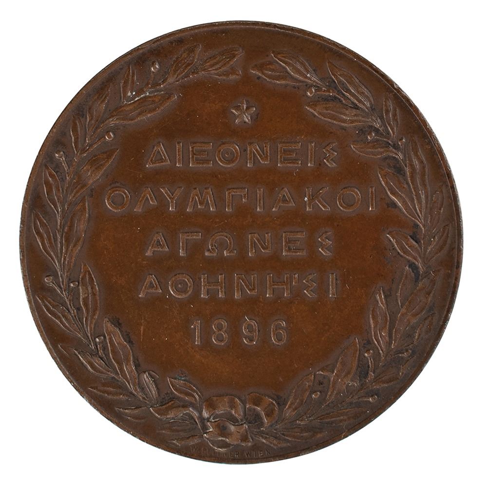 Participation medal issued for the Athens 1896 Olympics. Bronze, 50 mm, 58 gm, by W. Pittner, Austria. The front features a seated Nike holding a laurel wreath over a phoenix emerging from flames, with Acropolis in the background; the reverse bears a star surmounted above five lines of Greek legend set within a laurel wreath. A decidedly clean example.