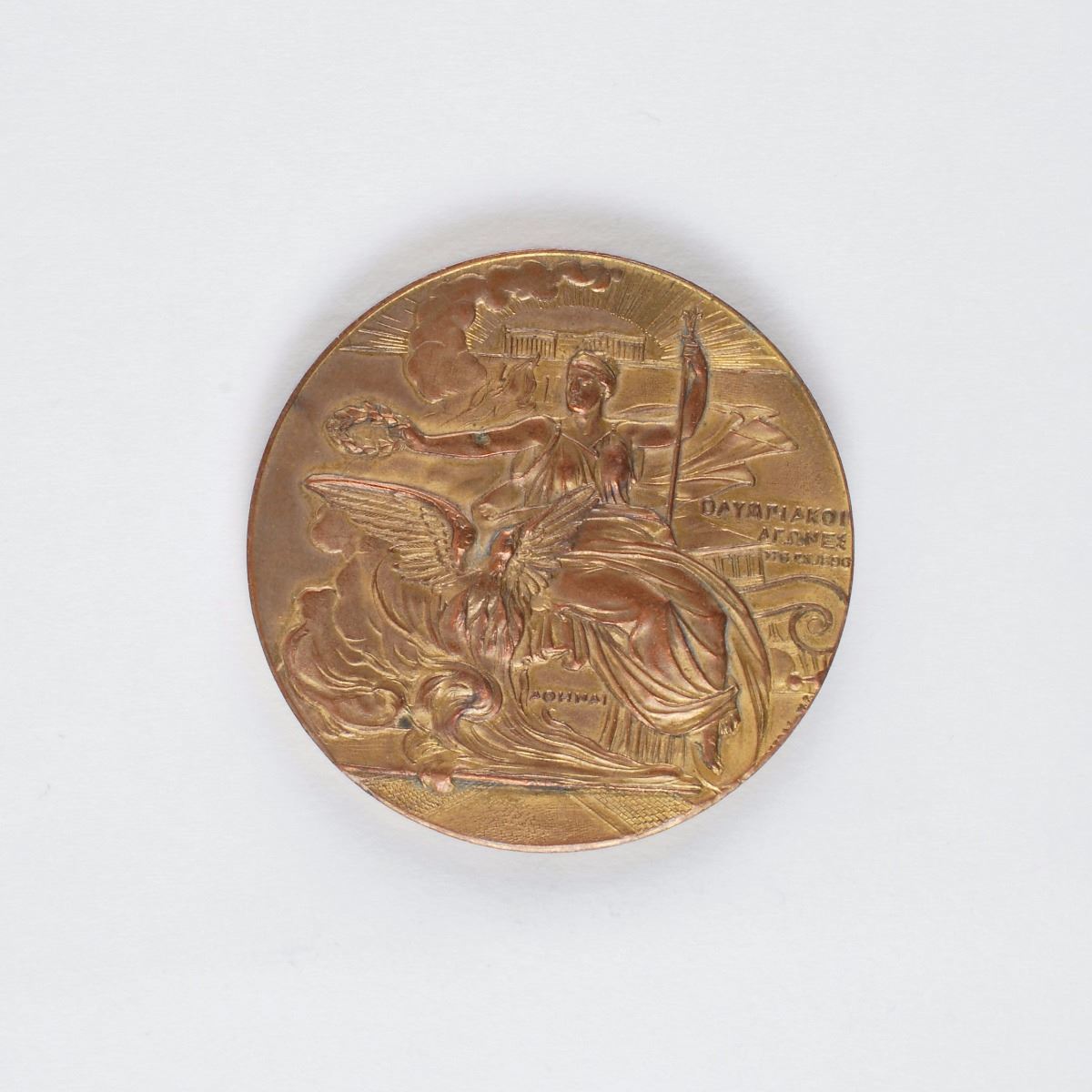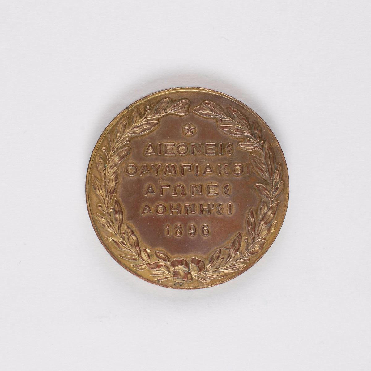 Participation medal issued for the Athens 1896 Summer Olympics. Gilt Bronze, 50 mm, 58 gm, by W. Pittner, Austria. The front features a seated Nike holding a laurel wreath over a phoenix emerging from flames, with Acropolis in the background; the reverse bears a star surmounted above five lines of Greek legend set within a laurel wreath. The immolation of the phoenix and emergence from the ashes symbolizes the rebirth of the Olympic Games after a hiatus of more than 1,500 years. An uncommon and desirable medal given the sheer historical significance of the Olympiad and how so few examples were ultimately struck.