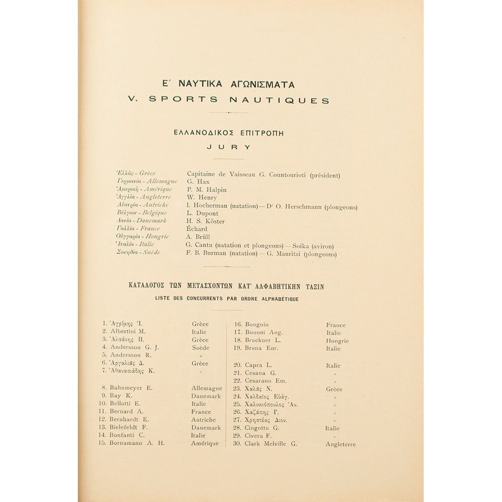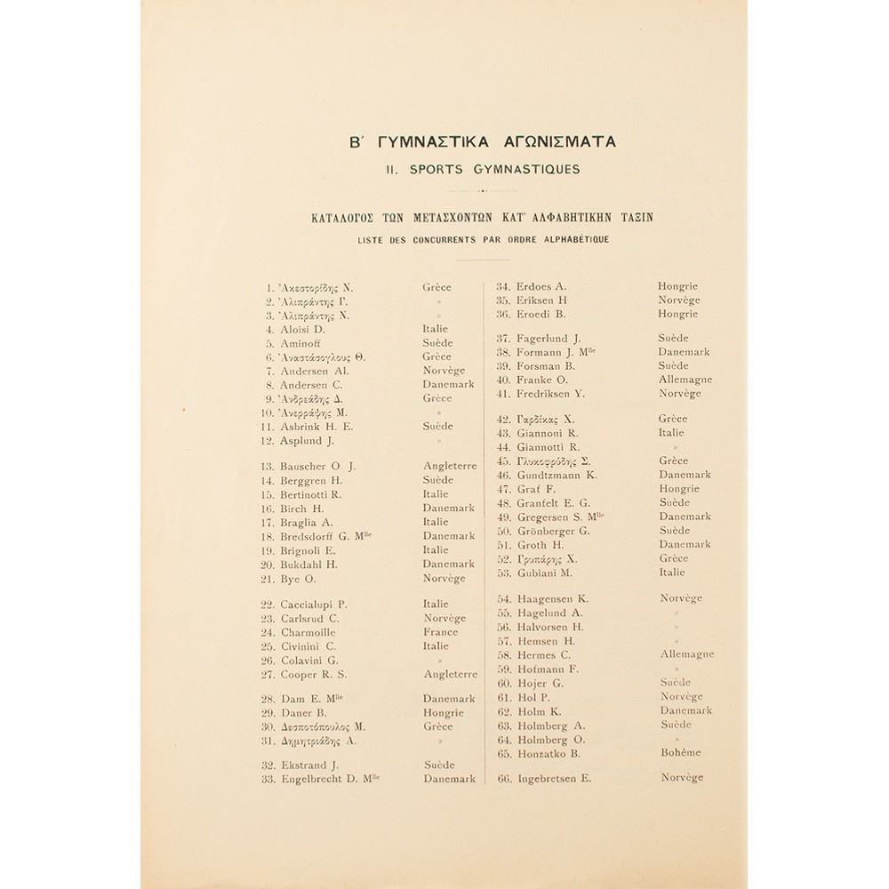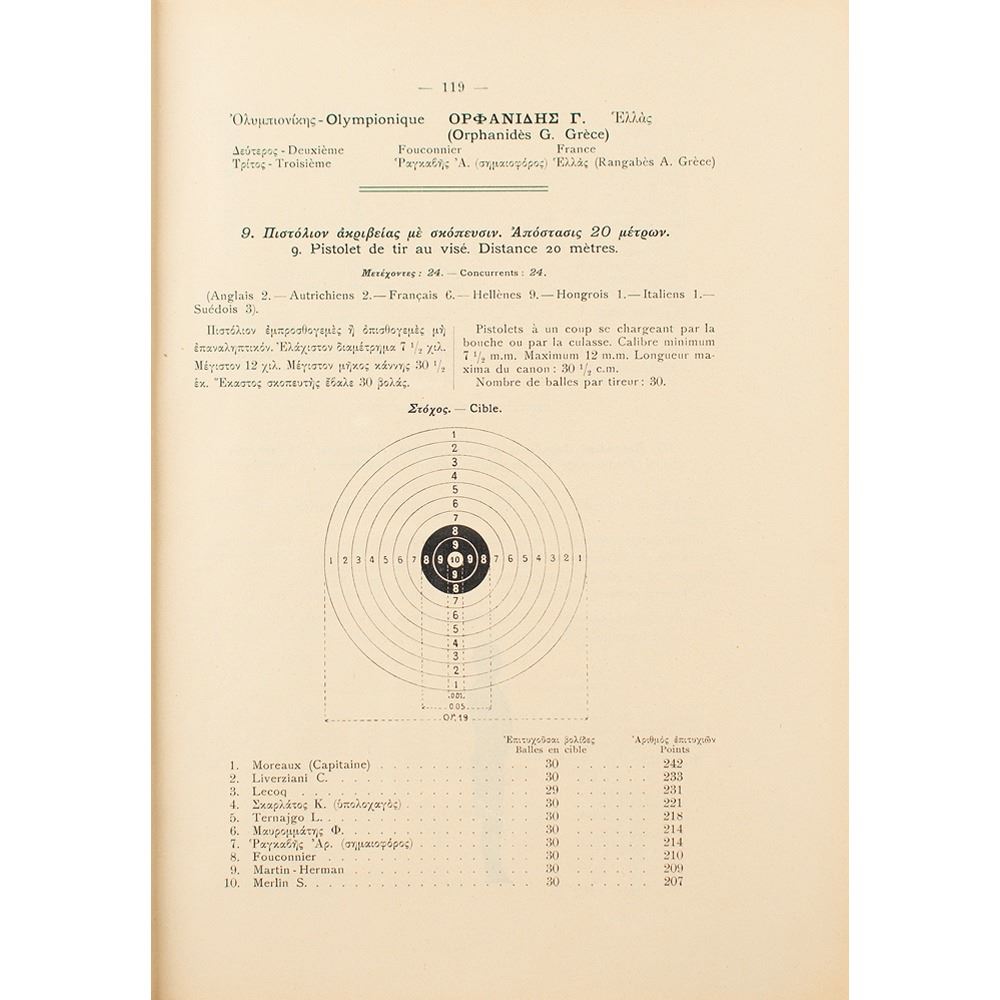 Extremely rare Greek-and-French language official results booklet from the Athens 1906 Intercalated Olympics, No. 4, dated June 2, 1906, published by the Olympic Organizing Committee. The booklet, 106 pages (pp. 70–176), 8.5 x 11.5, entitled “Bulletin of the Committee of the Olympic Games in Athens / International Olympic Games 1906, Official Results,†contains results for gymnastics, shooting, fencing, water sports, and athletic events, as well as detailed information about the Olympic Games, such as athlete names and nationality, events, rules, regulations, and a list of the Olympic jury members. The front cover features ownership notations, and many of the pages are uncut. In very good to fine condition, with edgewear, a tear to page 137/138, some rusting to binding staples, and a missing upper left corner to back cover.