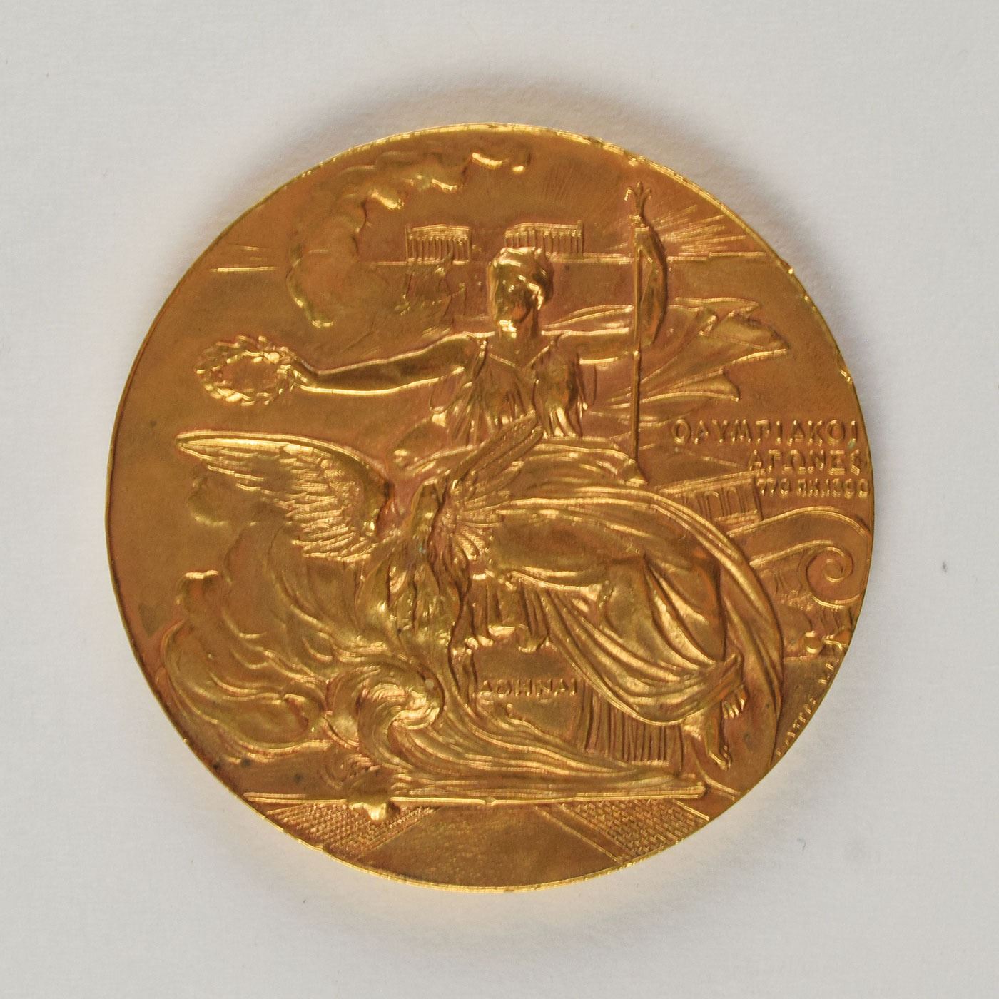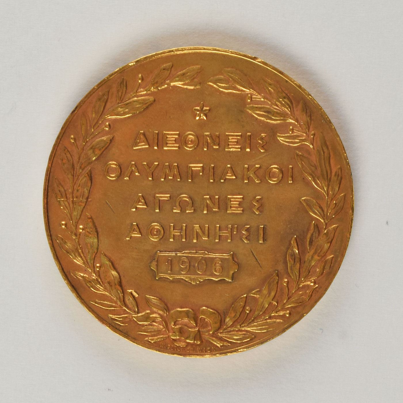 Participation medal issued for the Athens 1906 Intercalated Summer Olympics. Gilt bronze, 50 mm, 58 gm, by Nikephoros Lytras. The front shows a seated Nike holding a laurel crown above a phoenix rising from flames, with the Acropolis in the background; the reverse bears an inscribed Greek legend within a laurel wreath, with the mint along the bottom edge, "W. Pittner, Wien." Includes the seldom-seen original circular case. The 1906 Athens participation medal was manufactured from the unused inventory of the 1896 Athens participation medals; the only difference being that a 1906 plaque has been soldered over the original 1896 date.