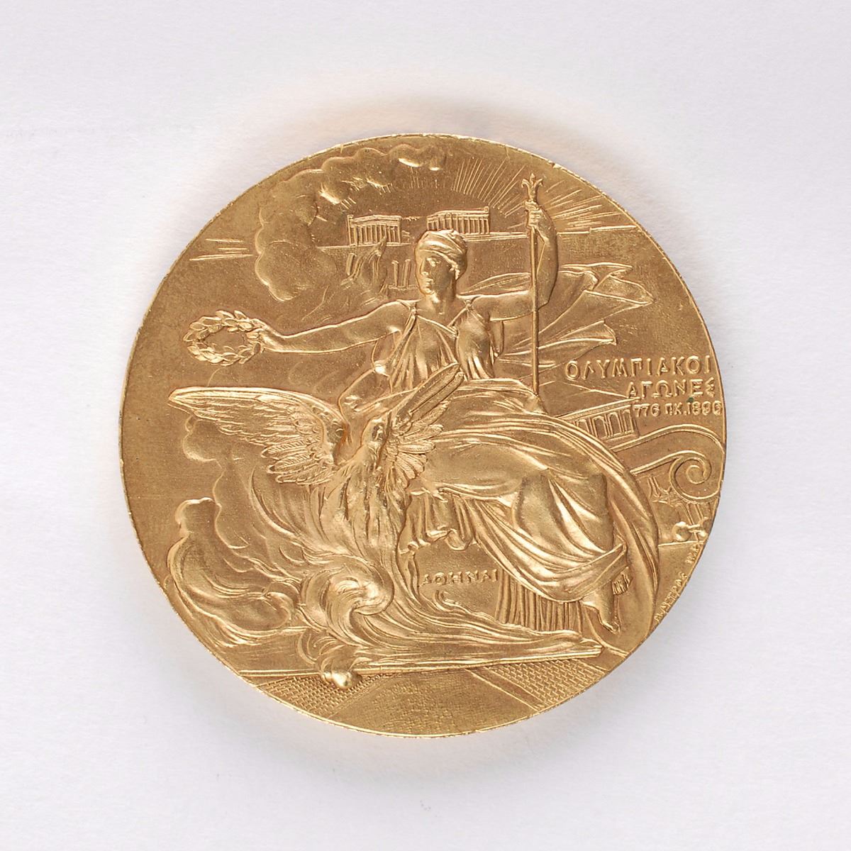 Participation medal issued for the 1906 Athens Olympics. Gilt bronze, 50 mm, 58 gm, by Nikephoros Lytras. The front shows a seated Nike holding a laurel crown above a phoenix rising from flames, with the Acropolis in the background; the reverse bears an inscribed Greek legend within a laurel wreath. The 1906 Athens participation medal was manufactured from the unused inventory of the 1896 Athens participation medals; the only difference being that a 1906 plaque has been soldered over the original 1896 date.