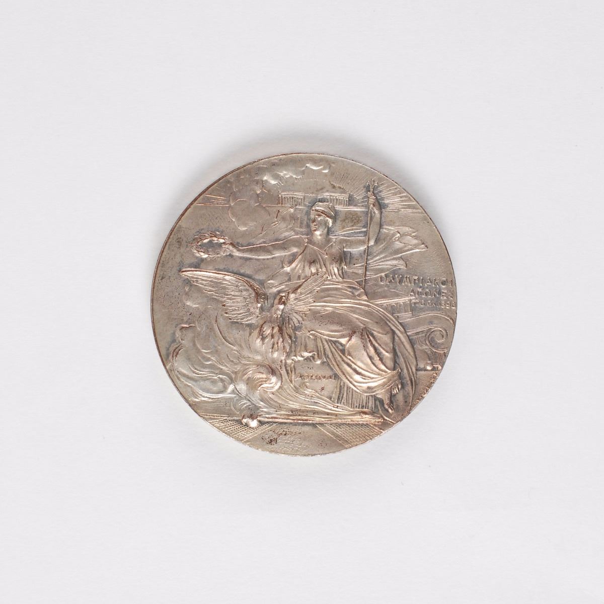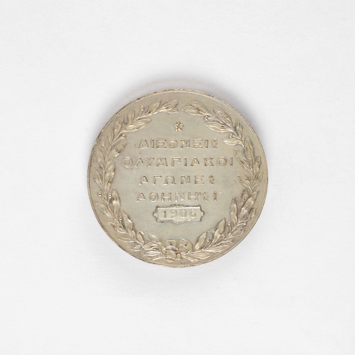 Participation medal issued for the 1906 Athens Olympics. Silvered bronze, 50 mm, 58 gm, by Nikephoros Lytras. The front shows a seated Nike holding a laurel crown above a phoenix rising from flames, with the Acropolis in the background; the reverse bears an inscribed Greek legend within a laurel wreath. The 1906 Athens participation medal was manufactured from the unused inventory of the 1896 Athens participation medals; the only difference being that a 1906 plaque has been soldered over the original 1896 date.