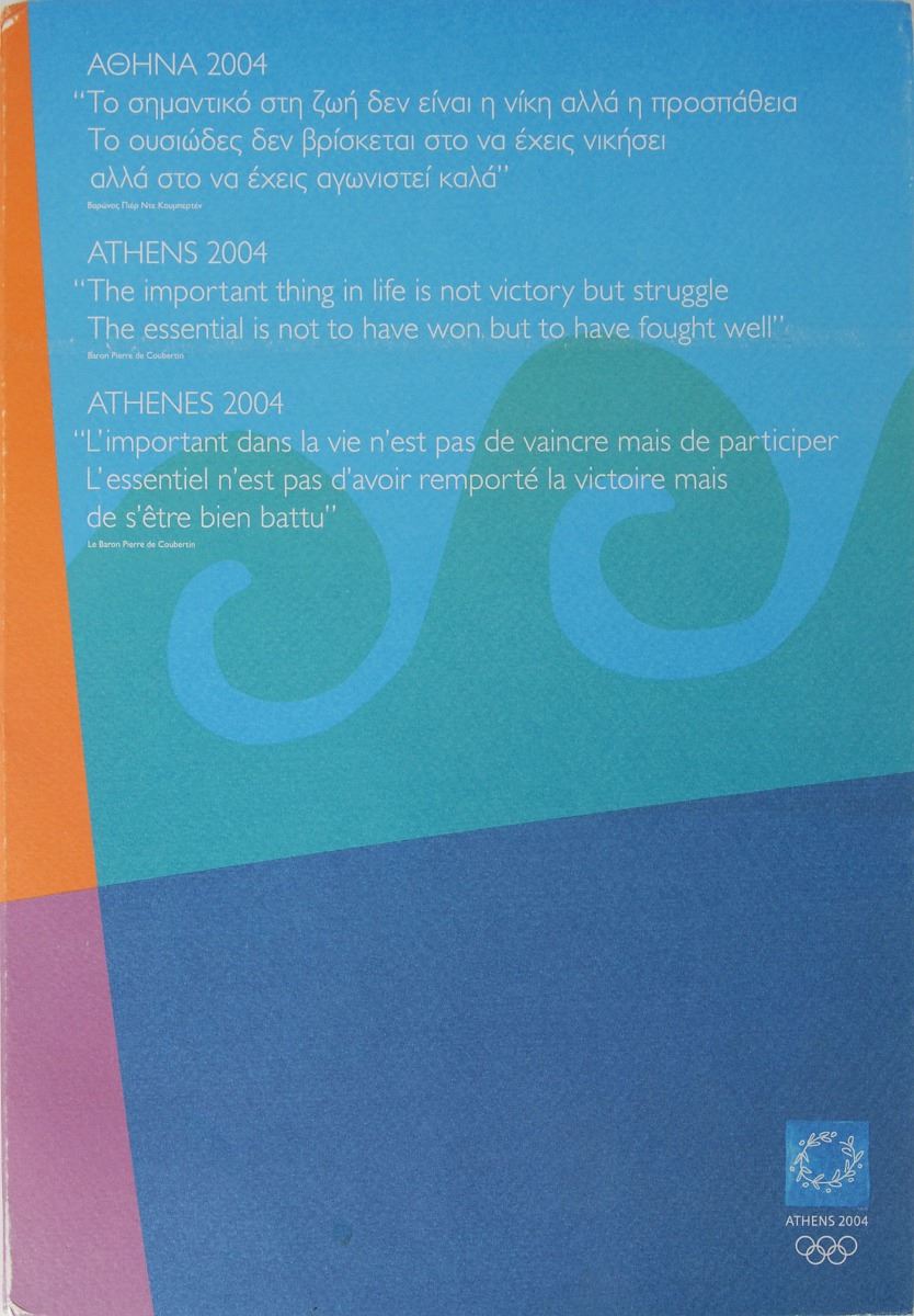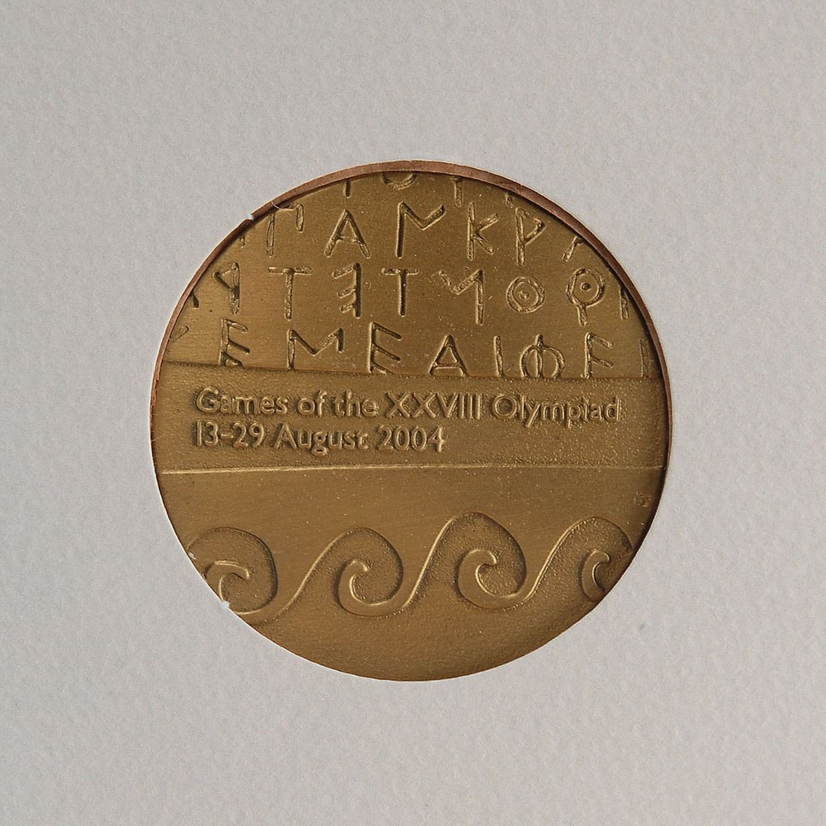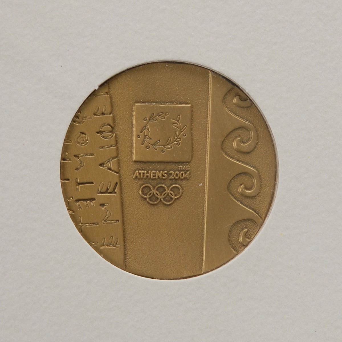 Participation medal issued for the Athens 2004 Summer Olympics. Bronze, 50 mm, 61 gm, minted by Efsimon. The front features Greek lettering and waves of the Aegean sea on either side of the Athens Games emblem; the reverse bears raised text between a similar design as the front, “Games of the XXVIII Olympiad, 13–29 August 2004.” Includes the original presentation folder and diploma.