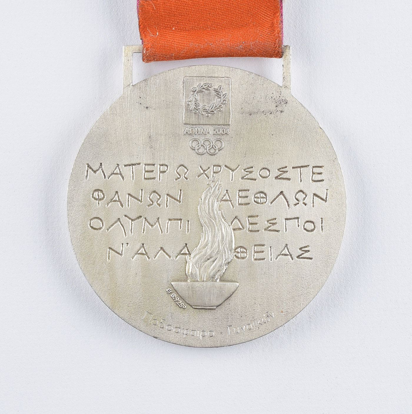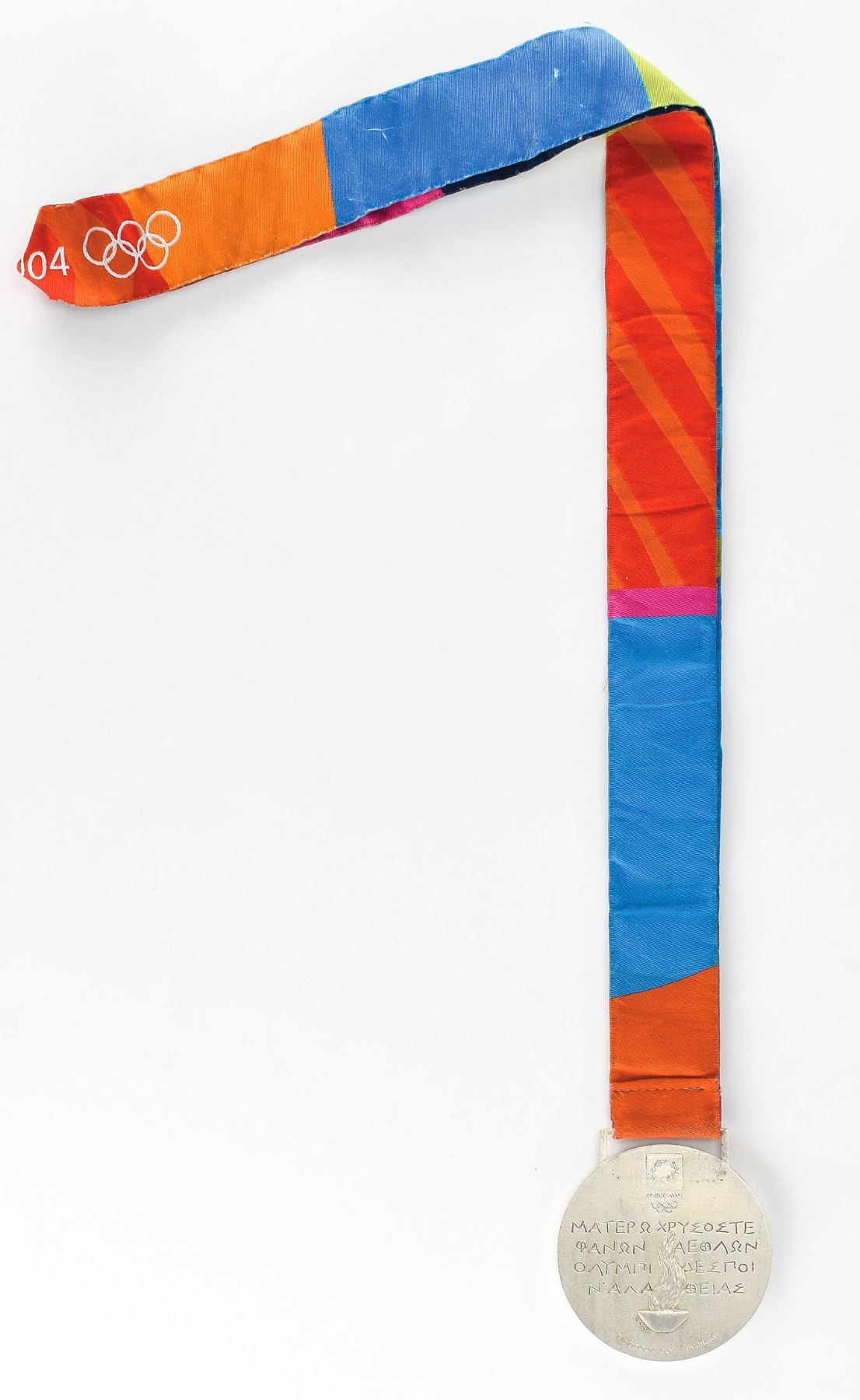 Exquisite winner’s medal awarded for women’s soccer at the Athens 2004 Summer Olympics. Silver, 60 mm, 139 gm, by Elena Votsi and Kostas Kazakos; manufactured by Efsimon. The front depicts the winged goddess of Victory soaring into the Panathinaikos Arena, with Greek characters and Olympic rings above; the reverse features the Eternal Flame of Olympia, the opening lines of Pindar's Eighth Olympic Ode, and the 2004 Summer Games logo, with the sport engraved in Greek lettering along the bottom, “p?d?sfa??? ???a???? [Women–Football].” Completed by the original multicolored ribbon. The 2004 Athens winner’s medals replaced the long-held ‘seated Victory’ design by Giuseppe Cassioli, rectifying the mistake of using a depiction of the Roman Colosseum rather than a Greek venue. The gold medal game of the women’s football tournament consisted of a rematch between the United States and Brazil, with the former winning the initial contest 2-0 in first round action some 12 days earlier. Once again the Americans outlasted their Brazilian rivals 2-1 at the Karaiskaki Stadium in Piraeus, en route to winning their second-ever gold medal. Along with Birgit Prinz of Germany, Brazil's Cristiane led all scorers with five tournament goals. After a fourth place showing in Sydney, the Brazilian women’s team won silver in 2004, and then again in 2008 and 2012, before finally achieving a gold medal in 2016.