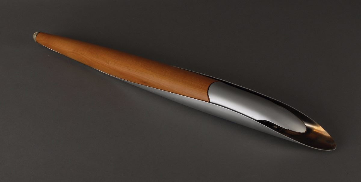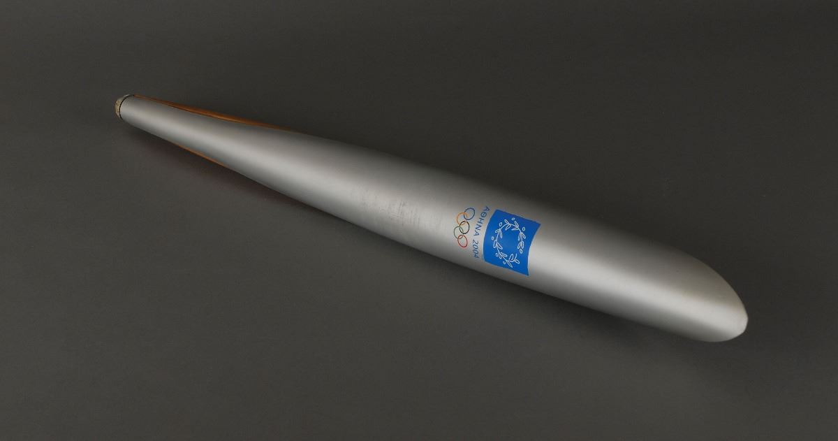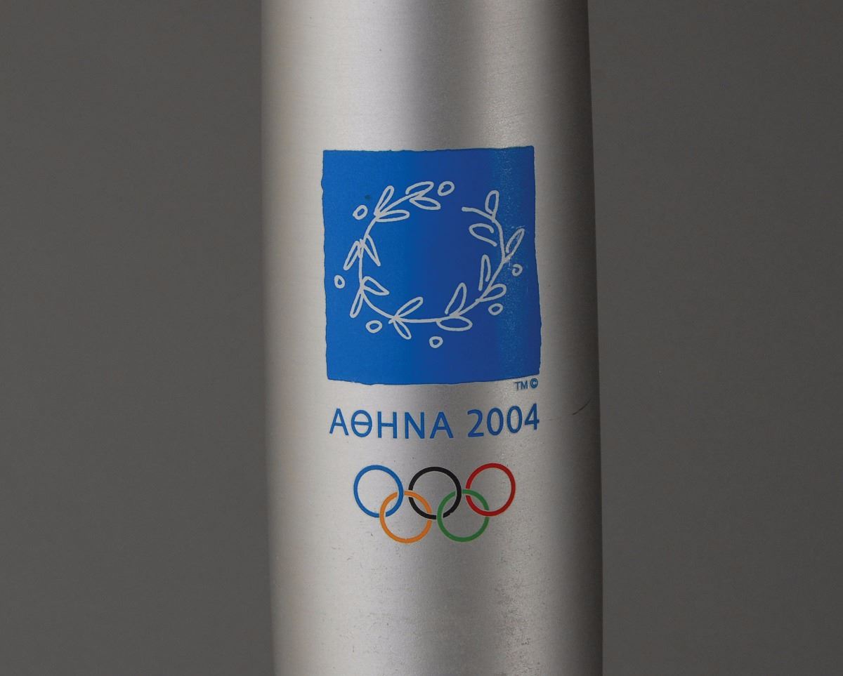 Official 2004 Athens Summer Olympics torch, constructed of aluminum and olive wood, measuring 25.75? in length and 2.25? at its widest point, designed by Andreas Varotsos and manufactured by GA & L Harrington. The torch was modeled to reflect the simple and congruous lines of an olive tree leaf, with the union of wood and metal evoking the different colors found on either side of the leaf, and the ergonomic design representing the extension of the moving flame. The front of the aluminum sheath bears the Olympic rings and Athens emblem. Some scuffing to metal and bottom tip repaired. The Olympic flame was lit in Olympia, Greece, on March 25, 2004, and proceeded on a five continent journey that witnessed the torch pass by all the cities that had hosted the Games since 1896, as well as marking the flame’s debut in Africa, India and South America. In total, the torch covered over 84,000 km during its 141–day journey.