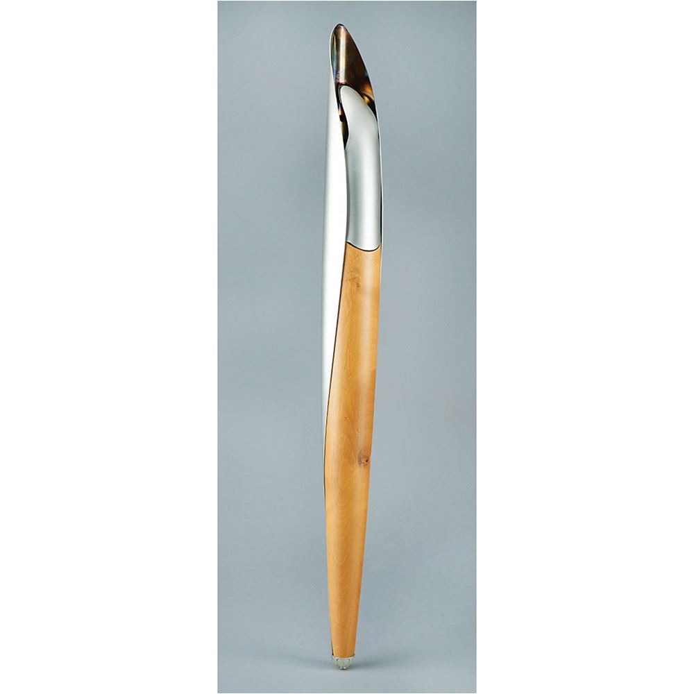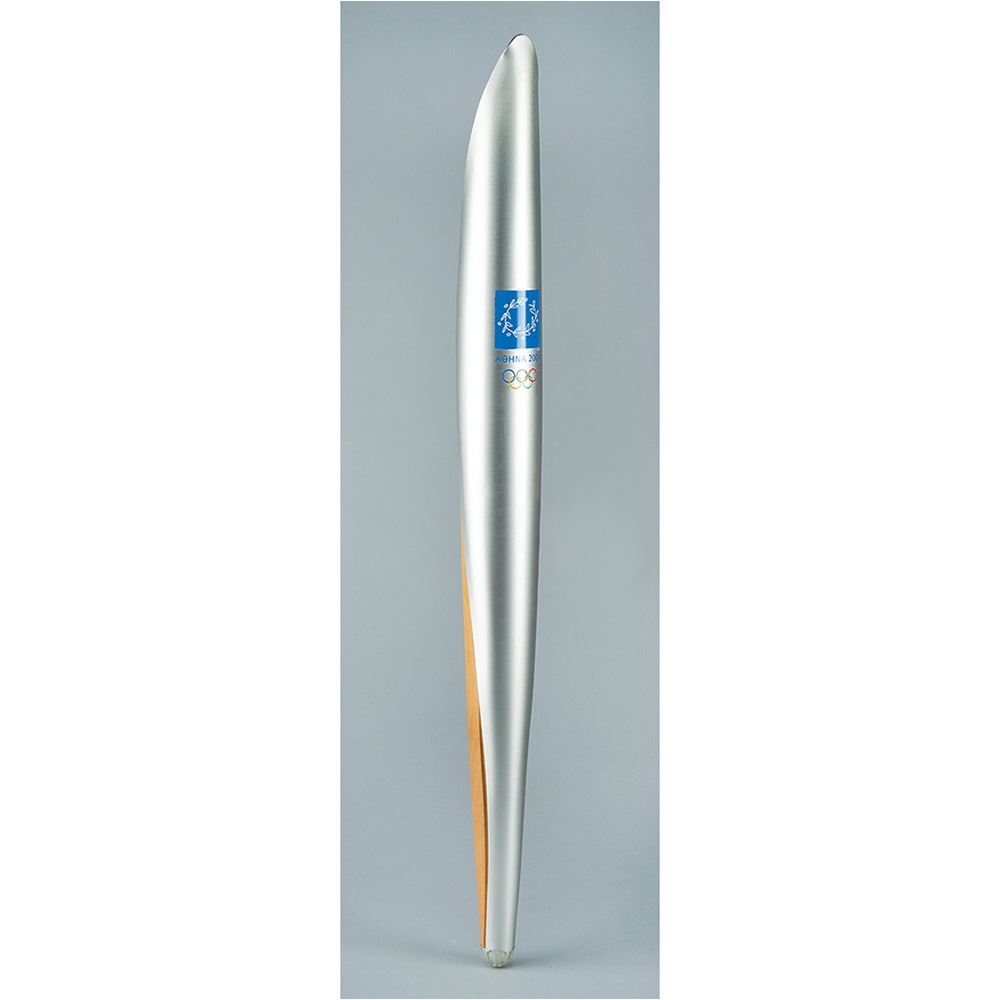 Official 2004 Athens Summer Olympics torch, constructed of aluminum and olive wood, measuring 25.75″ in length and 2.25″ at its widest point, designed by Andreas Varotsos and manufactured by GA & L Harrington. The torch was modeled to reflect the simple and congruous lines of an olive tree leaf, with the union of wood and metal evoking the different colors found on either side of the leaf, and the ergonomic design representing the extension of the moving flame. The front of the aluminum sheath bears the Olympic rings and Athens emblem, with Greek engraving below presented to Lena Zachopoulou. Small dents and marks to upper and lower tips of torch. Includes its original tube. The Olympic flame was lit in Olympia, Greece, on March 25, 2004, and proceeded on a five continent journey that witnessed the torch pass by all the cities that had hosted the Games since 1896, as well as marking the flame's debut in Africa, India, and South America. In total, the torch covered over 84,000 km during its 141-day journey.