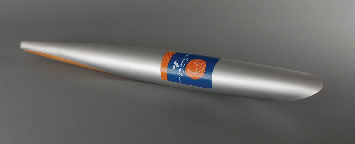 Official 2004 Athens Summer Paralympics torch, constructed of aluminum and olive wood, measuring 25.75? in length and 2.25? at its widest point, designed by Andreas Varotsos and manufactured by GA & L Harrington. The torch was modeled to reflect the simple and congruous lines of an olive tree leaf, with the union of wood and metal evoking the different colors found on either side of the leaf, and the ergonomic design representing the extension of the moving flame. The front of the aluminum sheath bears a label of the 2004 Paralympics emblem. The Olympic flame was lit in Olympia, Greece, on September 17, 2004, and a total of 705 torchbearers carried the Paralympics flame 410 km through 45 municipalities of Greece. This elegant torch includes its original shipping tube.