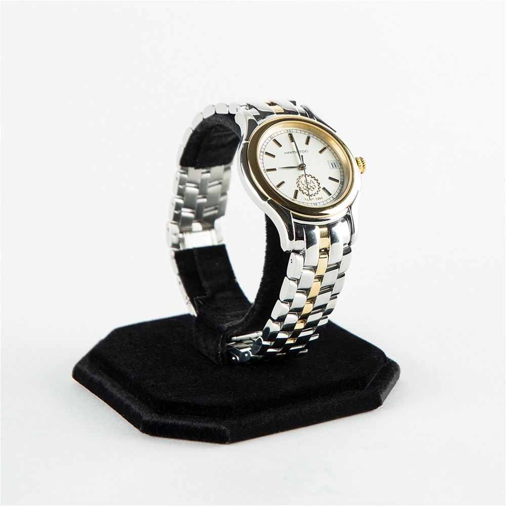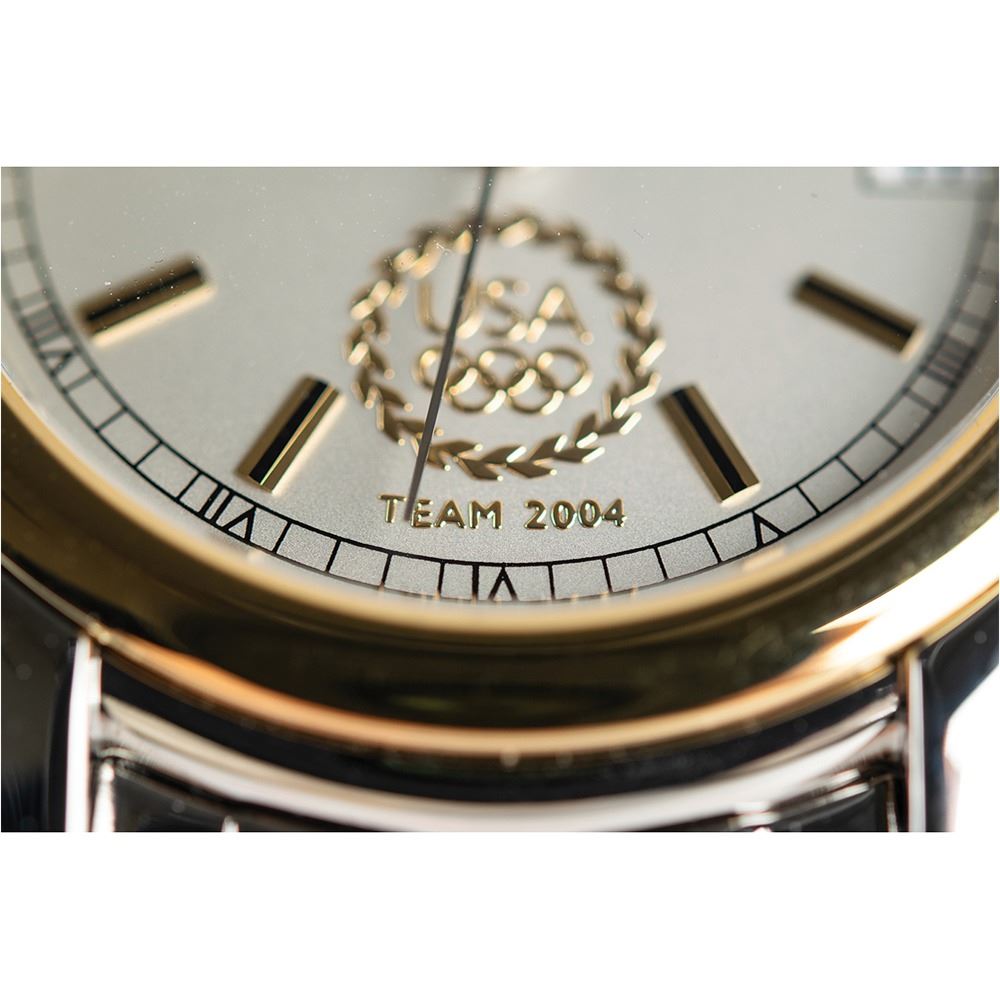 Official Hamilton watch presented to members of Team USA for the Athens 2004 Summer Olympics, featuring a white face with raised golden "USA Team 2004" Olympic ring insignia. The watch features a quartz movement, gold-tone bezel and hour markers, and a stainless steel bracelet band. Includes its original Hamilton presentation case, box, and instruction booklet. In very fine condition.