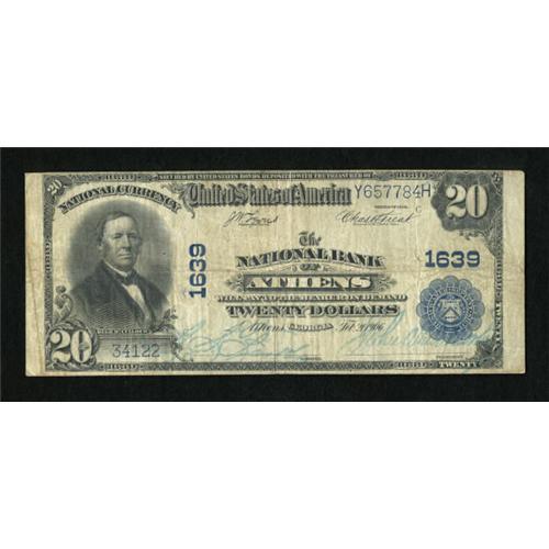 <B>Athens, GA</B></I> - $20 1902 Plain Back Fr. 651 <B>The NB of Athens</B></I> Ch. # 1639<BR> An evenly circulated <B>Fine.</B></I><BR><I>From The Amelia Island Collection.</B></I><BR><BR><b>Shipping:</b> Coins & Currency (<a target="_blank" href="http://www.heritageauctions.com/common/shipping.php">view shipping information</a>)