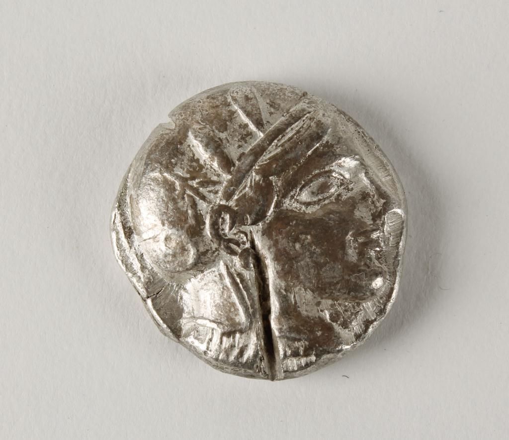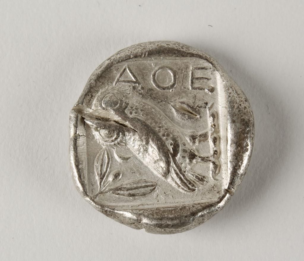 1 side shows an owl and the letters A O E and the opposite side shows a Grecian head, dated approx 415-336 B.C.