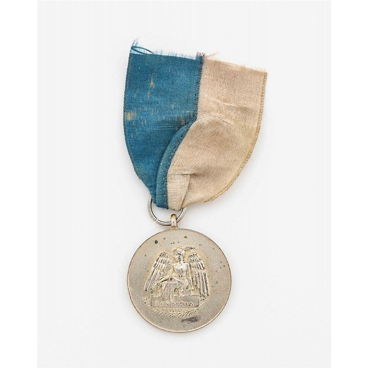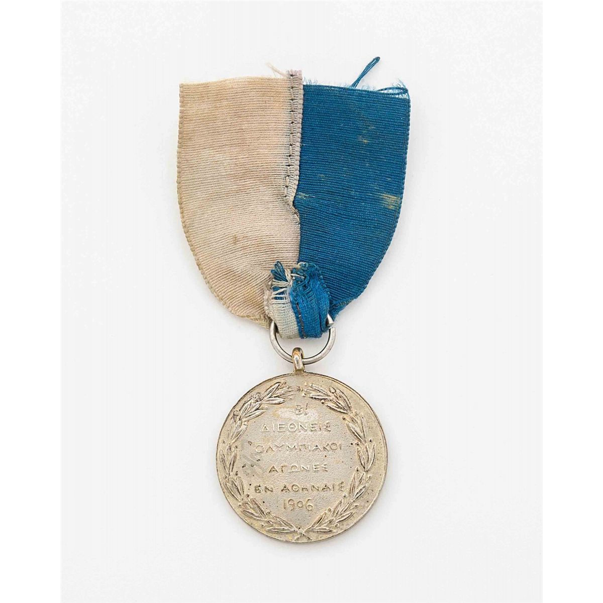 This 1906 Summer Games team silver winners medal is approximately 32mm in diameter, 2.1mm in thickness, and weighs approximately 18 grams. The winners medal was designed by Jules Chaplaint. One side of the medal features a seated Nike, from Ancient Stater of Hilias, with “Olympia,” in Greek, printed underneath. The reverse has a raised inscription, in ancient Greek, which reads, “B [meaning 2nd Athens Olympic Games]—International Olympic Games in Athens 1906.” Medal has a blue and white ribbon which was added later. Condition is extra fine. Though this particular type of medal was originally presented with a similar blue and white ribbon, the attractive one offered here is, to our knowledge, not original to the piece, though it is circa 1906. Teams that finished in first or second place in their events were presented medals like these. Silver was awarded for first place, bronze for second place, and no award at all for the third place team. Team 1906 winners medals are seldom seen.