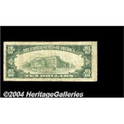 Athens, TN - $10 1929 Ty. 2 The First NB Ch. # 3341Fourteen small size notes from this bank appear in the new Kelly census, this one an About Fine example with a small split in the bottom edge at the center. <BR><BR><B>Important notice:</B> Heritage usually auctions material at the rate of 200-250 lots per hour. On some occasions eBay Live bid software or the Internet may not be able to keep up with the pace of the auction. We recommend placing a realistic absentee bid now as insurance to avoid disappointment. Occasionally the auctioneer may eliminate or reject an eBay Live bid, and the auctioneer may also reopen a lot after the close of the eBay live bidding (usually because we missed an audience bid), and may reject your bid even if it shows you as the winning bidder. By bidding via eBay Live, you agree that Heritage may award the lot to another bidder at its sole discretion under the circumstances described above or any other reasonable circumstances. Since eBay bids are not shown to us until we open the lot on the floor, we treat those bids just like floor bids. In most cases the floor responds before the eBay bid is presented to us, due to Internet lag time, so for consistency we have made it a policy that floor bids are always considered first over tie eBay live bids. Also please note that all Heritage lots purchased through eBay Live carry a 20% Buyer's Premium. Please make sure you read the Terms and Conditions before you bid. <BR><BR><B>IMPORTANT ANNOUNCEMENT ABOUT RESERVES:</B> Heritage now divulges all reserves on its web site 7 days before every auction. If you want to know whether the reserve on this lot has been met, and if not, what the reserve amount is, please visit this lot page on the HeritageCoin.com web site, or email: bid@HeritageGalleries.com