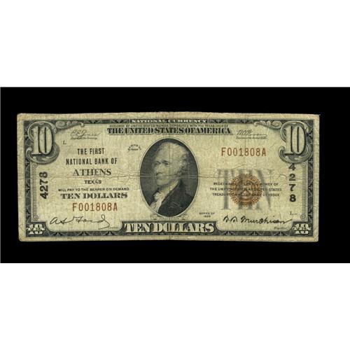 <B>Athens, TX</B></I> - $10 1929 Ty. 1 <B>The First NB</B></I> Ch. # 4278<BR>Type one examples only in small size from this tough east Texas bank. <B>Very Good-Fine.</B></I>