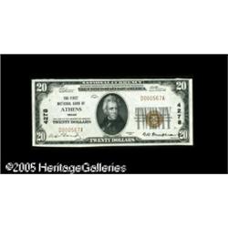 <B>Athens, TX</B></I> - $20 1929 Ty. 1 <B>The First NB </B></I> Ch. # 4278<BR>Although this note is listed in the census as CU, we'll opt for <B>About Uncirculated</B></I> due to the presence of a light centerfold. Even given that, however, it is a premium note on a challenging bank, which was the only one of the two issuing institutions in town to print the 1929 $20 denomination. At our 2003 Central States Numismatic Society Signature Sale in St. Louis we sold a nowhere near as nice looking $20 on this same bank in Fine for $575. This much nicer example will certainly top that result by a considerable margin. Lot:16982