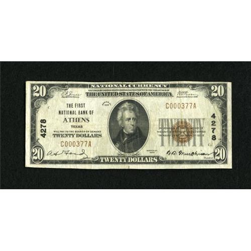 <B>Athens, TX</B></I> - $20 1929 Ty. 1 <B>The First NB</B></I> Ch. # 4278<BR> A nice small size example from this scarce bank that is the more often seen of the two banks in this Henderson County town. <B>Fine</B></I>, with A.S. Ford signing as cashier and T.F. Murchison signing as president.<BR><BR><b>Shipping:</b> Coins & Currency (<a target="_blank" href="http://www.heritageauctions.com/common/shipping.php">view shipping information</a>)