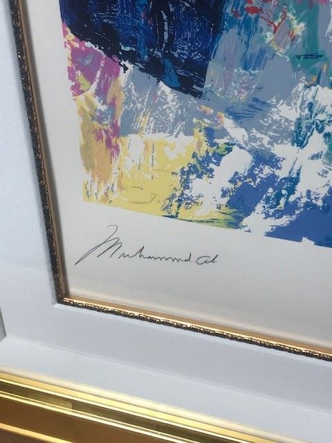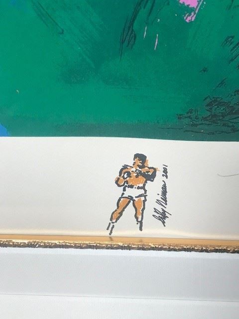 Hand signed by the artist and the original signature of the subject, Muhammad Ali!! This special edition, of which only 50 were done this way, also features the rare additional drawings of Ali at the bottom of the piece by Neiman, which are also autographed by Muhammad Ali!!! Limited edition serigraph #403 of 850 - Framed size = 43" x 60"