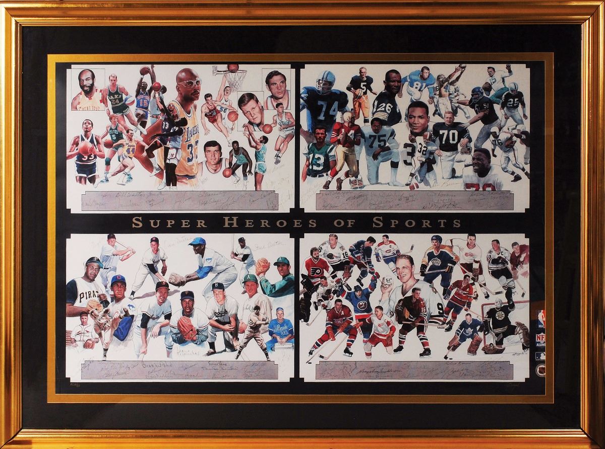 Color limited edition 42 x 28 lithograph entitled ‘Super Heroes of Sports,’ numbered 41/50, signed in felt tip by sixty-eight sporting legends from baseball, football, basketball, and hockey, including: Jim ‘Catfish’ Hunter, Willie Stargell, Duke Snider, Ernie Banks, Brooks Robinson, Enos Slaughter, Fergie Jenkins, Juan Marichal, Monte Irvin, Gaylord Perry, Bob Feller, George Kell, Bob Lemon, Bobby Doerr, Rollie Fingers, Nolan Ryan, Phil Niekro, Steve Carlton, Tom Seaver, Don Sutton, Warren Spahn, Don Maynard, Herb Adderley, Fred Biletnikoff, Bob Lilly, Y. A. Tittle, ‘Nighttrain’ Lane, Elroy Hirsch, Deacon Jones, Paul Hornung, Dick Butkus, Steve Van Buren, Roosevelt Brown, Marion Motley, Art Donovan, Joe Namath, Rick Barry, Kareem Abdul-Jabbar, David Thompson, Nate Thurmond, Jerry West, Dolph Schayes, Bill Walton, Jerry Lucas, Earl Monroe, Dave DeBusschere, Clyde Lovellette, Bill Sharman, Ed Macauley, Nate Archibald, Walt Bellamy, Walt Frazier, Mike Bossy, Brad Park, Henri Richard, Jean Beliveau, Frank Mahovlich, Stan Mikita, Bobby Hull, Bernie “Boom Boom” Geoffrion, Bernie Parent, Alex Delvecchio, Pierre Pilote, Marcel Dionne, Ted Lindsay, Gerry Cheevers, and John Bower. Also signed by artist George Bungarda. Double-matted and framed to an overall size of 52 x 38. In fine condition, with most signatures faded a few shades light. A fantastic assemblage of some of sports’ true heroes.