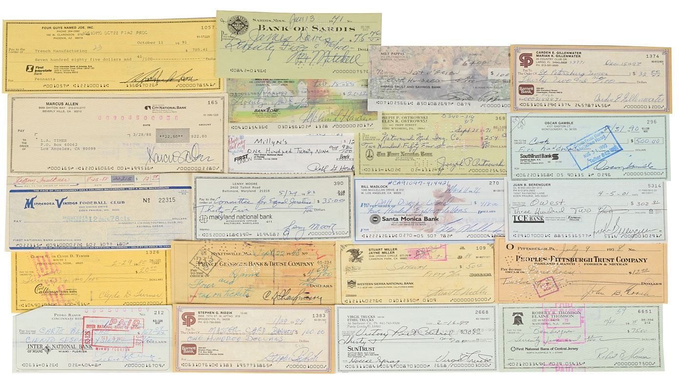 Collection of 21 checks signed by various sports figures, including: Juan Berenguer, Oscar Gamble, Carden Gillenwater, John B. Gooch, Meadowlark Lemon, Ralph Houk, Mel Harder, William Mitchell, Stu Miller, Bill Madlock, Joe Ostrowski, Milt Pappas, Pedro Ramos, Steve Ridzik, Virgil Trucks, Bobby Thomson, Jeff Faulkner, Clyde Turner, Clark Shaughnessy, Lenny Moore, and Marcus Allen. In overall fine condition.
