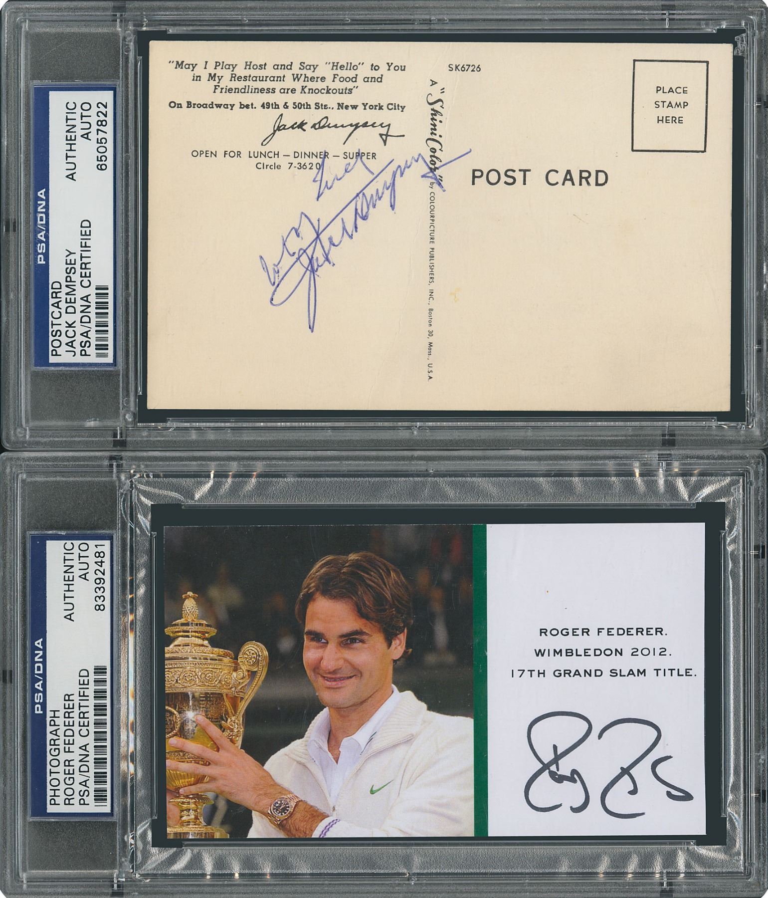 Four items signed by legendary athletes, including: Jack Dempsey (postcard), Roger Federer (SP), Roger Staubach (FDC), and Pete Rose (FDC). In overall fine condition. All are encapsulated in PSA/DNA authentication holders.