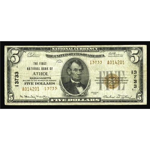 <B>Athol, MA</B></I> - $5 1929 Ty. 2 <B>The First NB</B></I> Ch. # 13733<BR>This was the last of three banks located here to receive its federal charter and the only one to issue the type two design. Its two competitors floundered in August of 1933, entering receivership on consecutive days. Tonight's example is an appealing <B>Fine+</B></I> free from any impairments such as pinholes or circulation soiling inconsistent with the assigned grade. While the census now stands at 15 in the three denominations issued from here, $5, $10 and $20, six of these are from the $5 #1 sheet.
