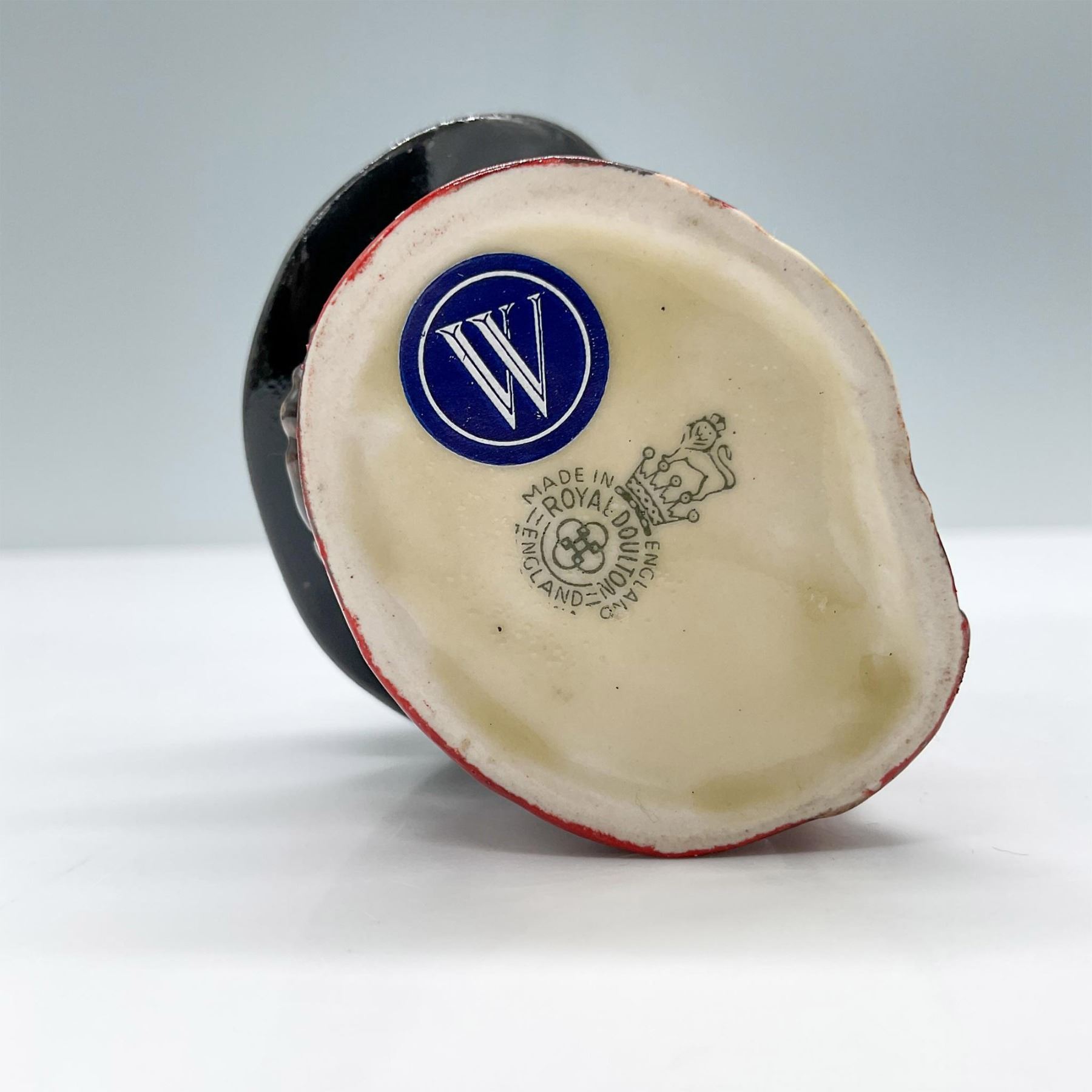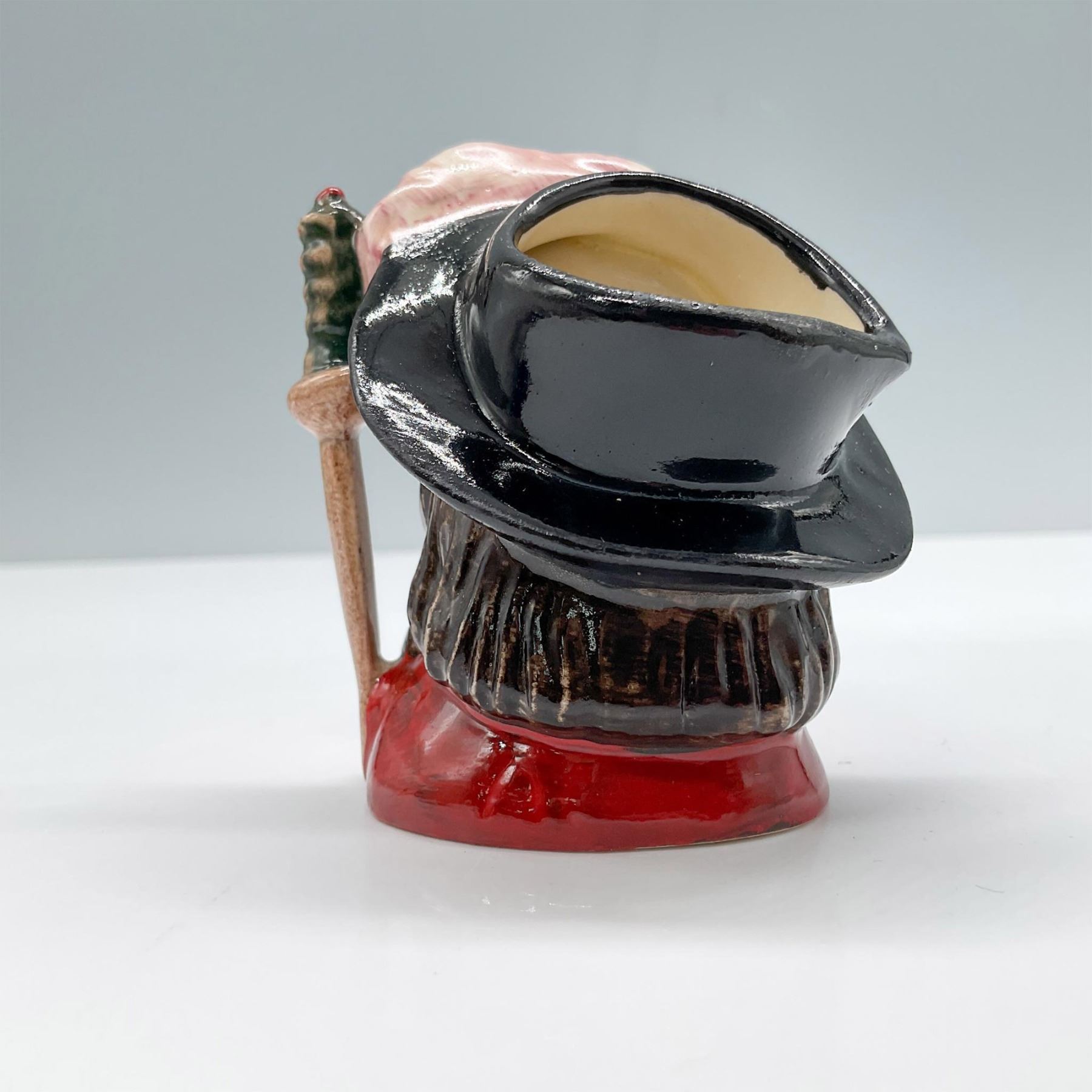 Figural jug of one of the Three Musketeers from the 19th century novel by Alexander Dumas. Scarlet red coat with a yellow neck ruffle, Black hat with a pink feather. Sword and shield as the handle. Royal Doulton backstamp.