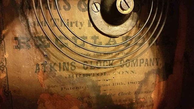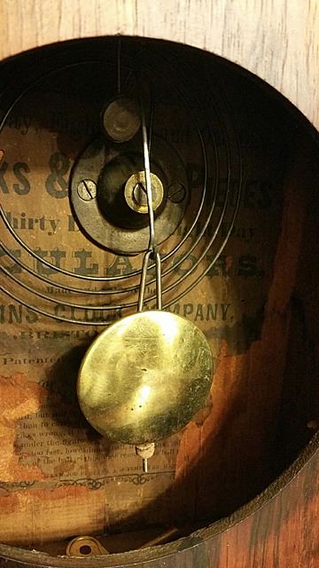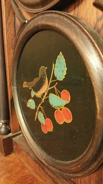 Atkins Clock Company, Bristol, CT Figure 8 Shelf Clock, rosewood with bird on cherry tree branch on lower glass, measures approx. 10" x 16 1/2".