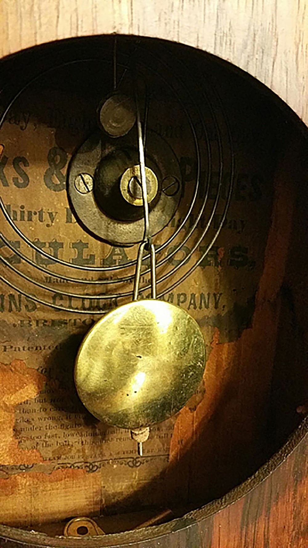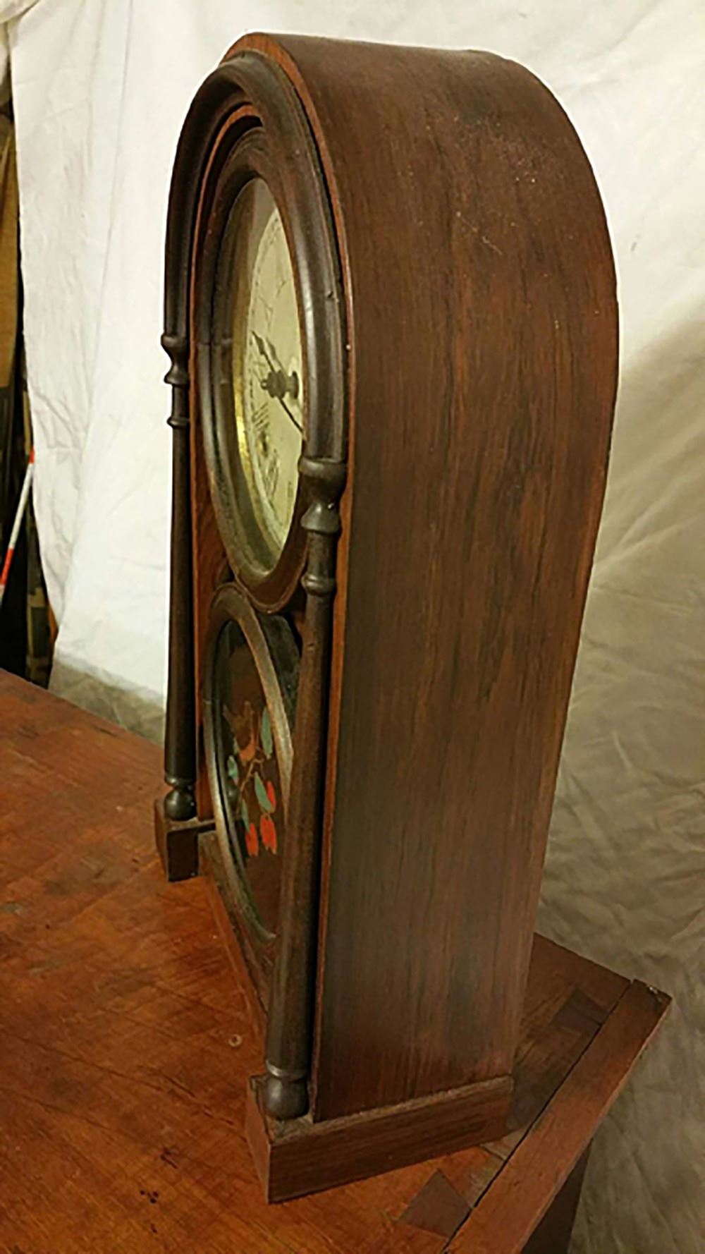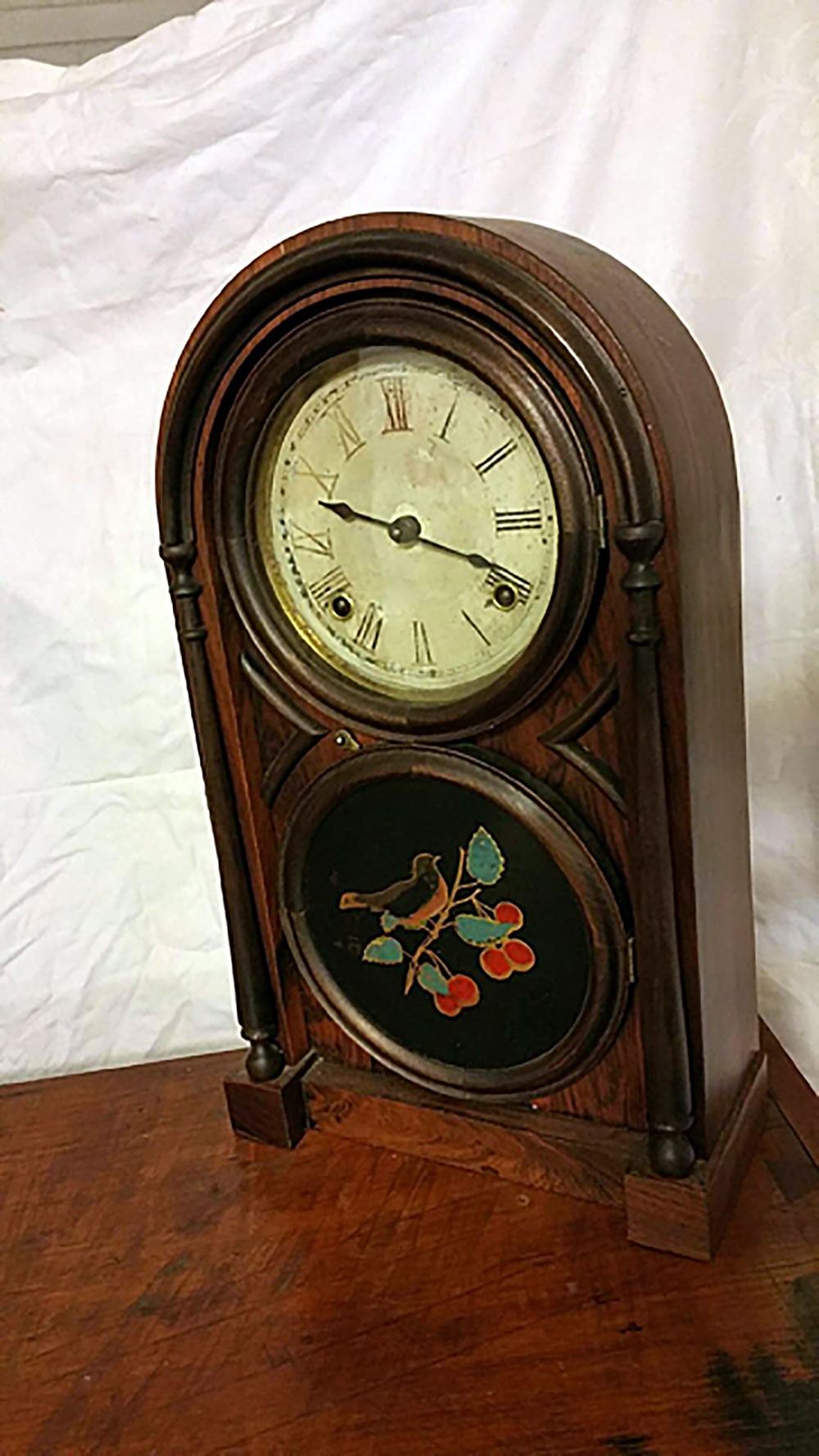 Atkins Clock Company, Bristol, CT Figure 8 Shelf Clock, rosewood with bird on cherry tree branch on lower glass, measures approx. 10 in x 16 1/2 in.