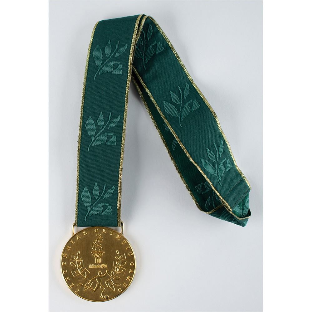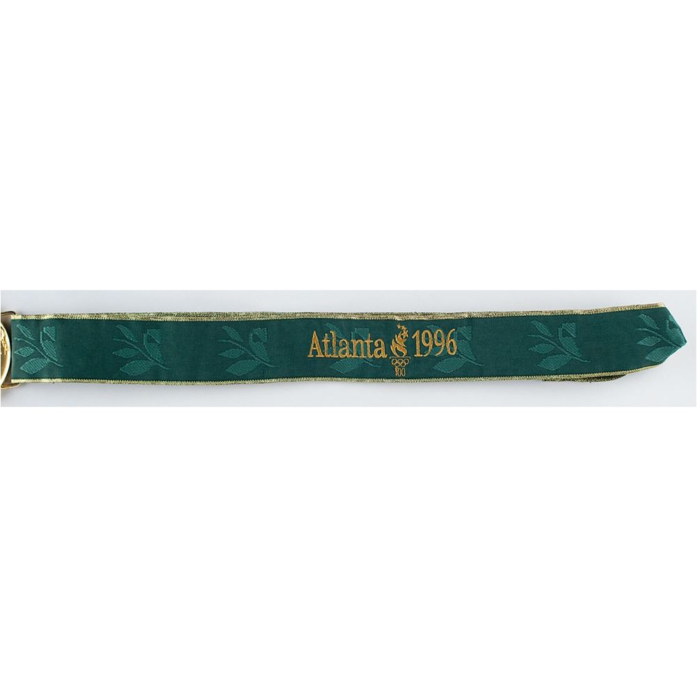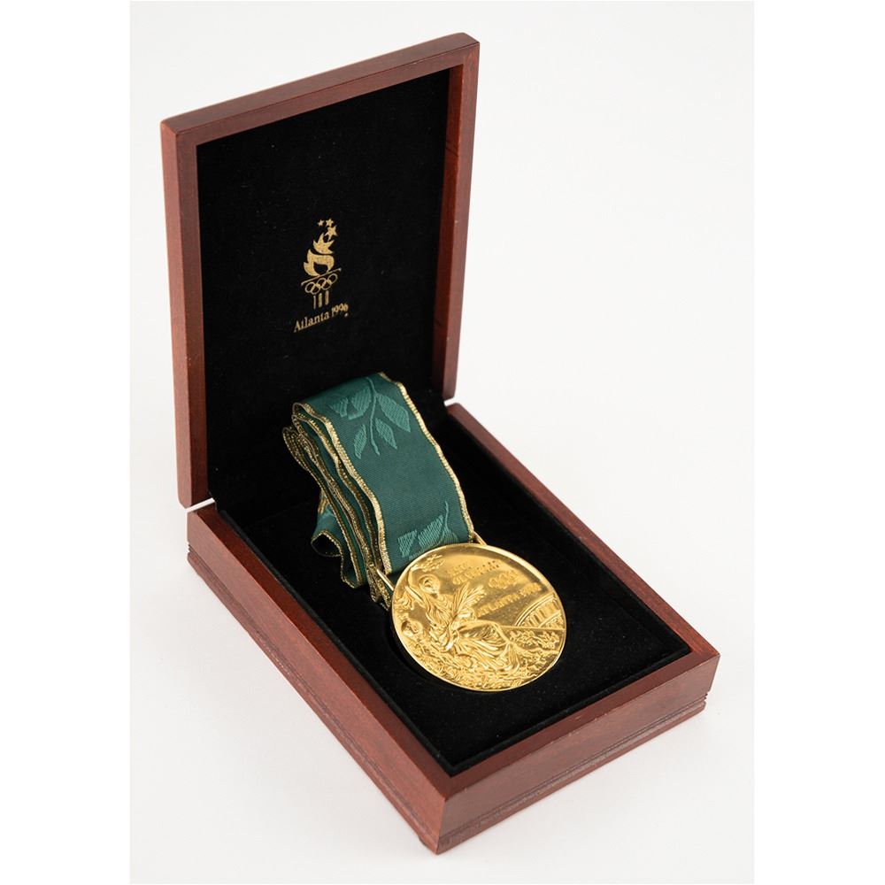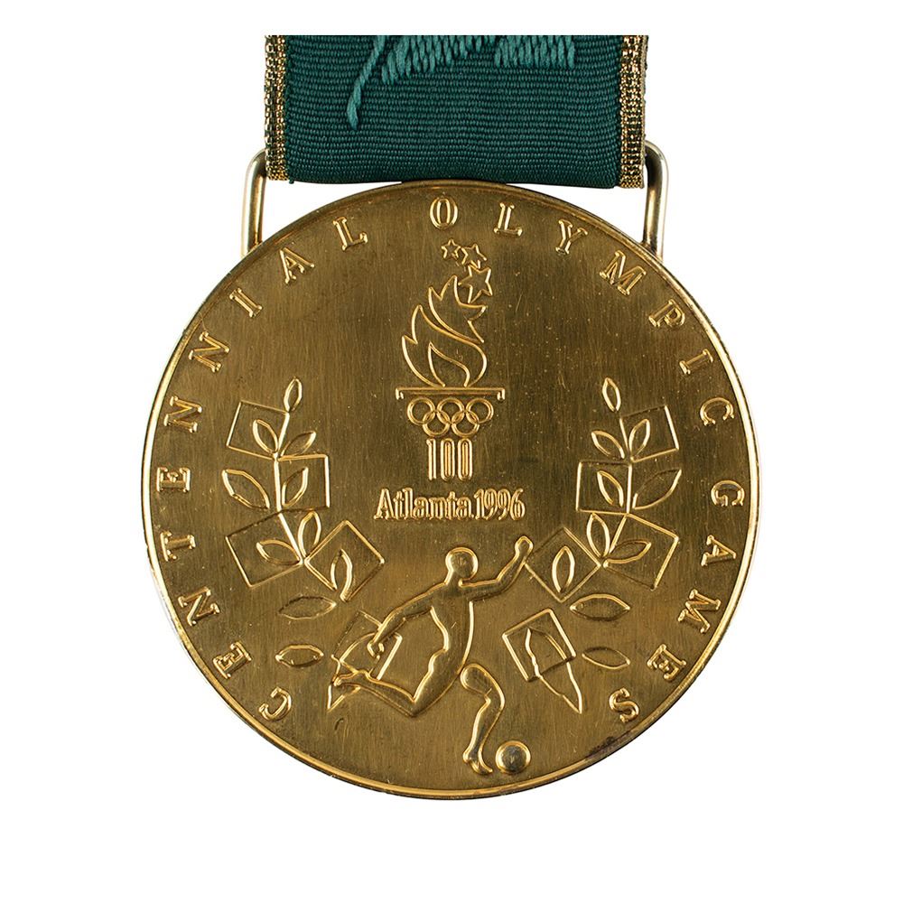 Hugely appealing winner's medal awarded to Nigerian footballer Tijani Babangida at the Atlanta 1996 Summer Olympics. Gilt silver, 70 mm, 180 gm, by Malcolm Grear Designers; manufactured by Reed and Barton. The front, inscribed "XXVI Olympiad Atlanta 1996" with Olympic rings, shows a ‘Seated Victory’ holding a laurel wreath and palm branch, with the Colosseum looming in the background; the reverse, inscribed "Centennial Olympic Games," features the Atlanta logo and a stylized 'Quilt of Leaves' olive branch pictogram of a soccer player. The medal is engraved on the bottom edge with the name of the sport: “Men’s Football.†Includes the original green-and-gold ribbon, the attractive wooden display case (which bears a few scuffs and dings), which is laser-cut on the lid with the centennial host logo and lined on the interior in black felt.