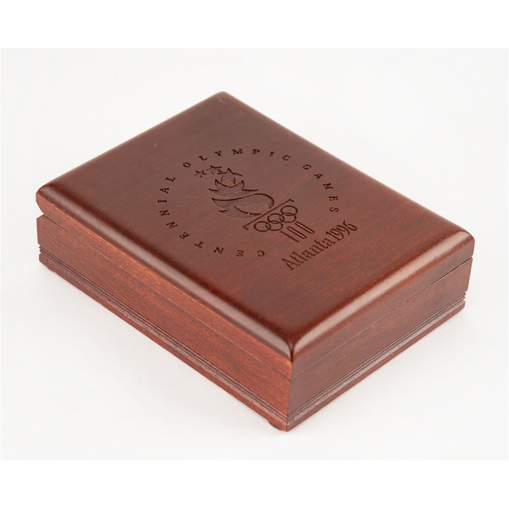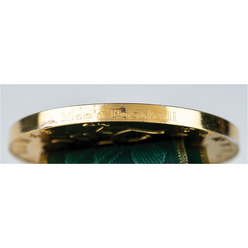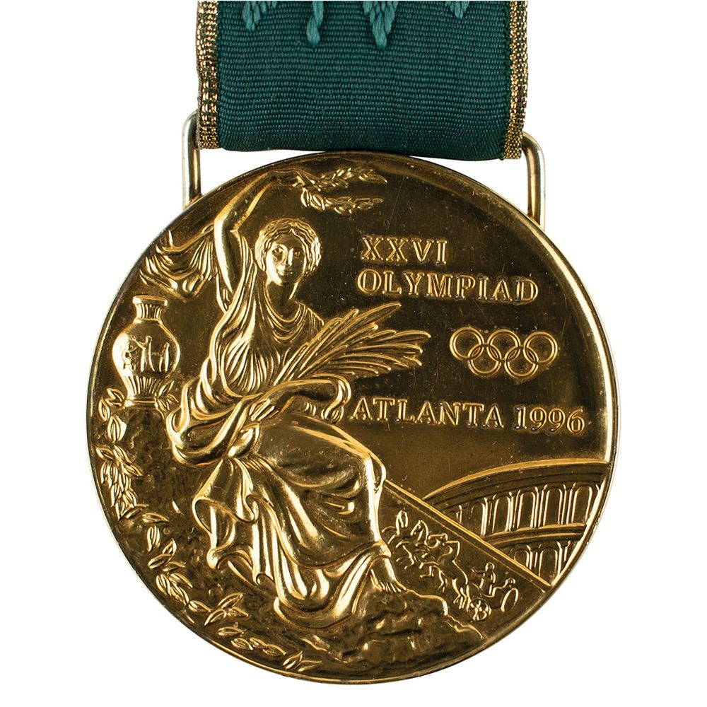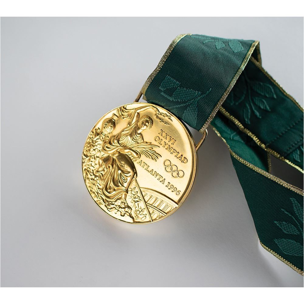 Hugely appealing winner's medal awarded to Nigerian footballer Tijani Babangida at the Atlanta 1996 Summer Olympics. Gilt silver, 70 mm, 180 gm, by Malcolm Grear Designers; manufactured by Reed and Barton. The front, inscribed "XXVI Olympiad Atlanta 1996" with Olympic rings, shows a ‘Seated Victory’ holding a laurel wreath and palm branch, with the Colosseum looming in the background; the reverse, inscribed "Centennial Olympic Games," features the Atlanta logo and a stylized 'Quilt of Leaves' olive branch pictogram of a soccer player. The medal is engraved on the bottom edge with the name of the sport: “Men’s Football.†Includes the original green-and-gold ribbon, the attractive wooden display case (which bears a few scuffs and dings), which is laser-cut on the lid with the centennial host logo and lined on the interior in black felt.