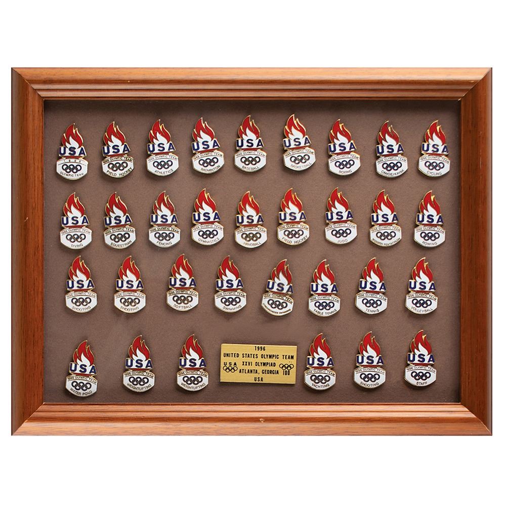 Collection of 32 Team USA Olympic pins from the Atlanta 1996 Summer Olympics, each 19 mm x 38 mm, which includes the following events and staff: Olympic Team, Field Hockey, Athletics, Badminton, Baseball, Basketball, Boxing, Canoe/Kayak, Cycling, Diving, Equestrian, Fencing, Gymnastics, Handball, Field Hockey, Judo, Modern Pentathlon, Rowing, Shooting (3), Softball, Swimming, Synchronized Swimming, Table Tennis, Tennis, Volleyball, Water Polo, Weightlifting, Yachting, and Staff. The pins are mounted and framed with an engraved plaque to an overall size of 12.75 x 9.75. In overall fine condition.