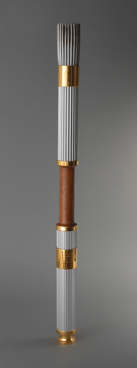 Official 1996 Atlanta Summer Olympics torch, constructed of gold-plated brass, aluminum, and Georgian pecan hardwood, measuring 31.75? in length and 2.5? at its widest point. Designed by Peter Mastrogiannis, the wooden handle represents the connection of the flame between heaven and earth, and the torch’s twenty-two reeds, representing every host city of the Olympic Games since 1896, are gathered by bands at the top and bottom, with the top displaying the Atlanta Games logo and the quilt of leaves design, and the bottom band listing all Olympic cities and their dates since 1896. Trivial scuffing to the bands and reeds. The torch relay was run from April 27 to July 19, 1966, and covered 26,875 km across the United States by over 12,000 torchbearers. Its journey included a trek on the Pony Express, a ride on the Union Pacific Railroad, and the first instance in which an Olympic relay torch made its way into space when it was carried aboard Space Shuttle Columbia as part of STS-78. A highly appealing relay torch from the Centennial Olympic Games. Oversized.
