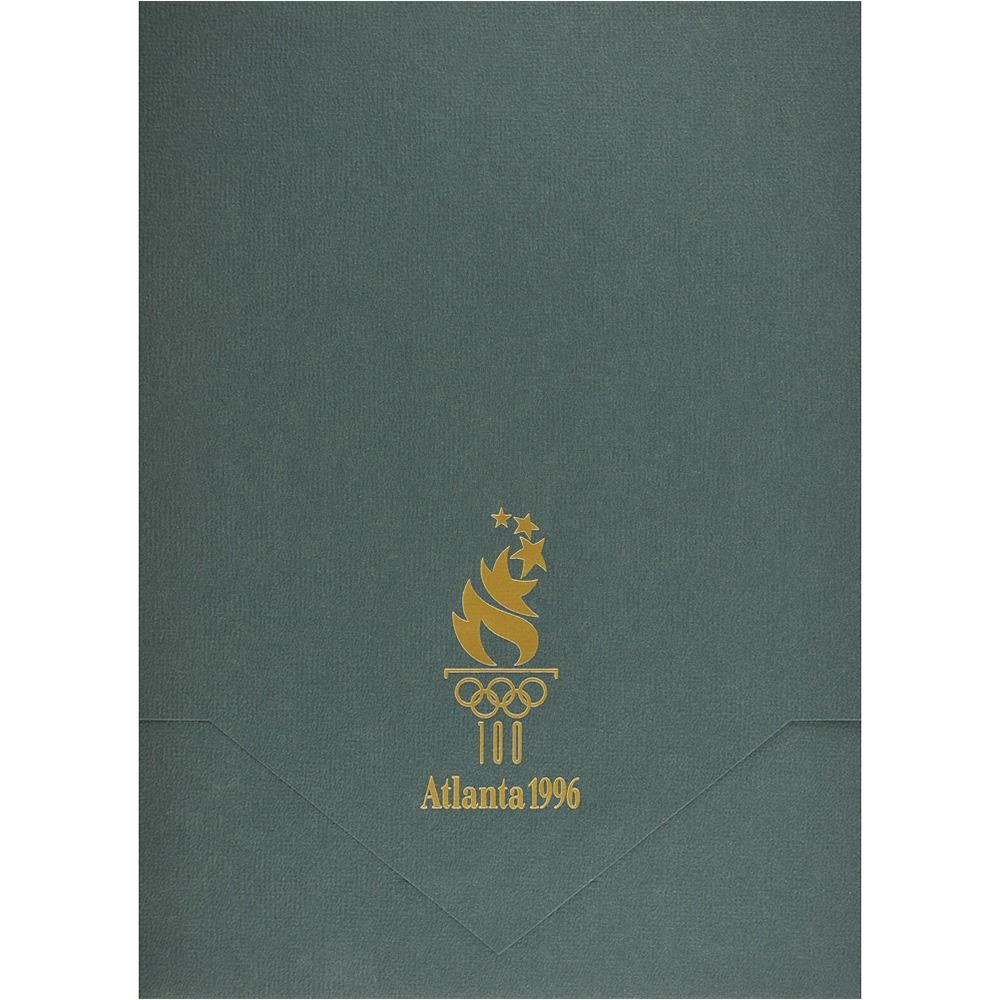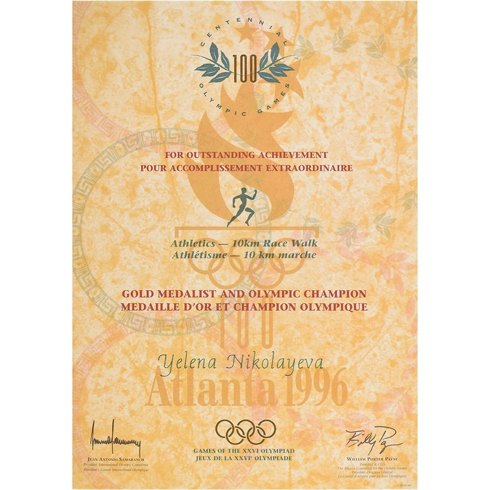 Official first-place winner's diploma from the Atlanta 1996 Summer Olympics, 8.5 x 12, awarded to Russian race walker Yelena Nikolayeva for her gold-medal finish in "Athletics—10km Race Walk." Complete with its original dark green folder, gilt-stamped with the logo of the Games. In fine condition.
