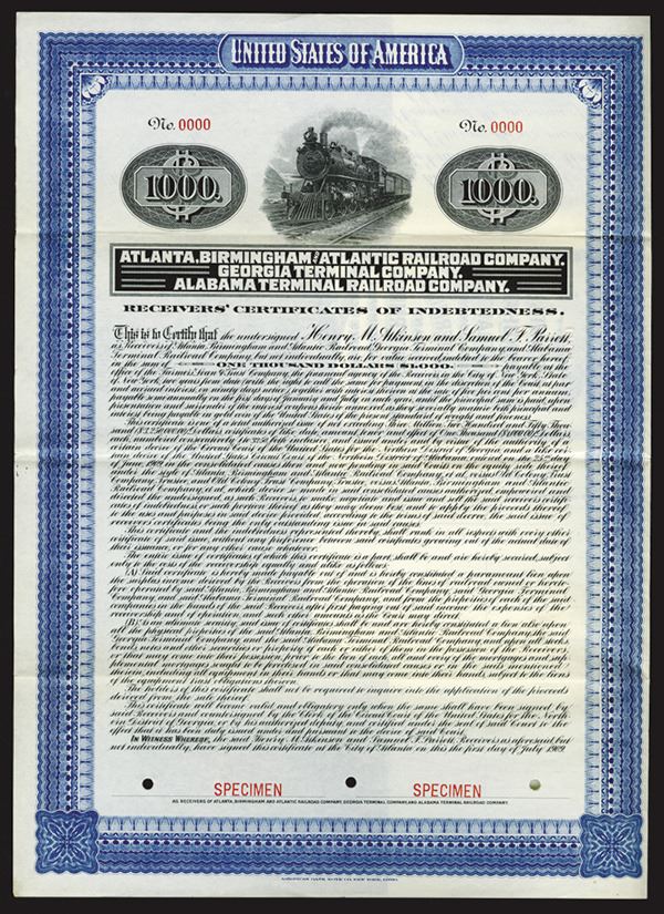 Georgia, South Carolina & North Carolina. $1000 Specimen 5% Receivers Certificate of Indebtedness, Black print on blue border and under tint, Approaching locomotive at top, Specimen overprints and POC's, VF-XF condition, ABNC.