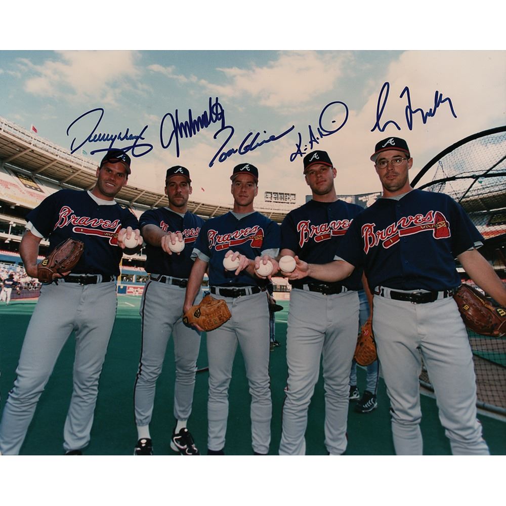 Color satin-finish 10 x 8 photo of the Atlanta Braves' dominant 1998 starting rotation, signed in blue felt tip by Greg Maddux, Tom Glavine, John Smoltz, Denny Neagle, and Kevin Millwood. In fine condition. A great image of one of the best starting staffs of all-time, with three Hall of Famers and two All-Stars.
