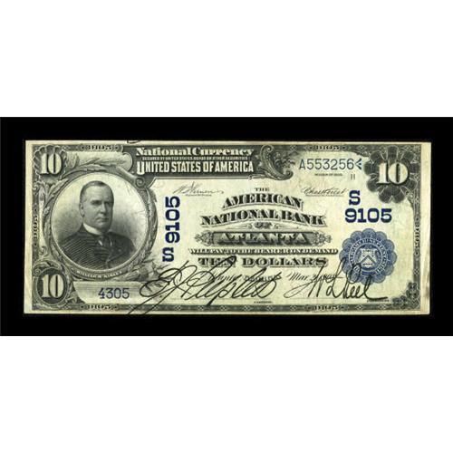 <B>Atlanta, GA</B></I> - $10 1902 Date Back Fr. 618 <B>The American NB</B></I> Ch. # (S)9105<BR> From our 2005 FUN auction where it was cataloged, "This scarce Atlanta institution issued Red Seals and Date Backs only during its short eight year life. This <B>About Uncirculated </B></I>example shows only minimal evidence of circulation and would be an attractive addition to any collection, whether based on scarcity or aesthetics."<B></B></I><BR><I>From The Amelia Island Collection.</B></I><BR><BR><b>Shipping:</b> Coins & Currency (<a target="_blank" href="http://www.heritageauctions.com/common/shipping.php">view shipping information</a>)
