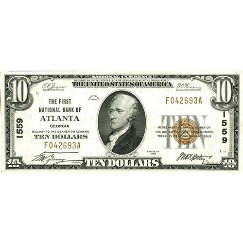 <B>Atlanta, GA</B></I> - $10 1929 Ty. 1 <B>The Atlanta NB</B></I> Ch. # 1559<BR>A well centered and fresh example. <B>Gem Crisp Uncirculated.</B></I>